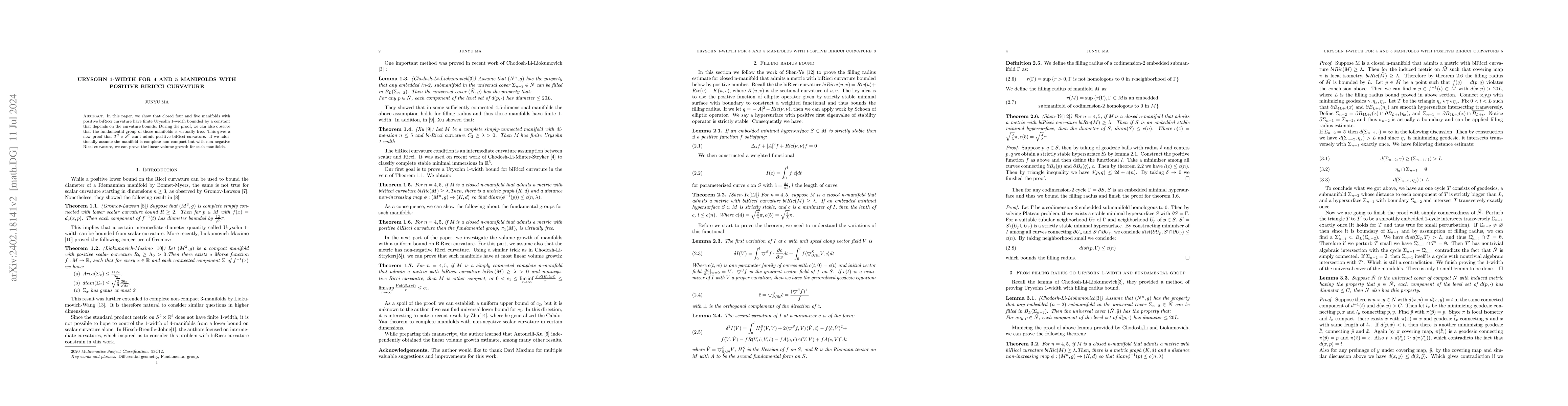 It was proved by Gromov-Lawson\cite{gl83} that complete three manifold with positive scalar curvature bounded below has finite Urysohn 1-width only depends on the uniform positive scalar curvature bounds. It is natural to ask the same question for the four manifolds. In this paper, we can show that closed four and five manifolds with positive biRicci curvature has finite Urysohn 1-width only depends on the curvature bounds. During the proof we can also observe that the fundamental group of those manifolds are virtually free. This gives a quick application that $T^{2}\times S^{2}$ can't admit positive biRicci curvature.
