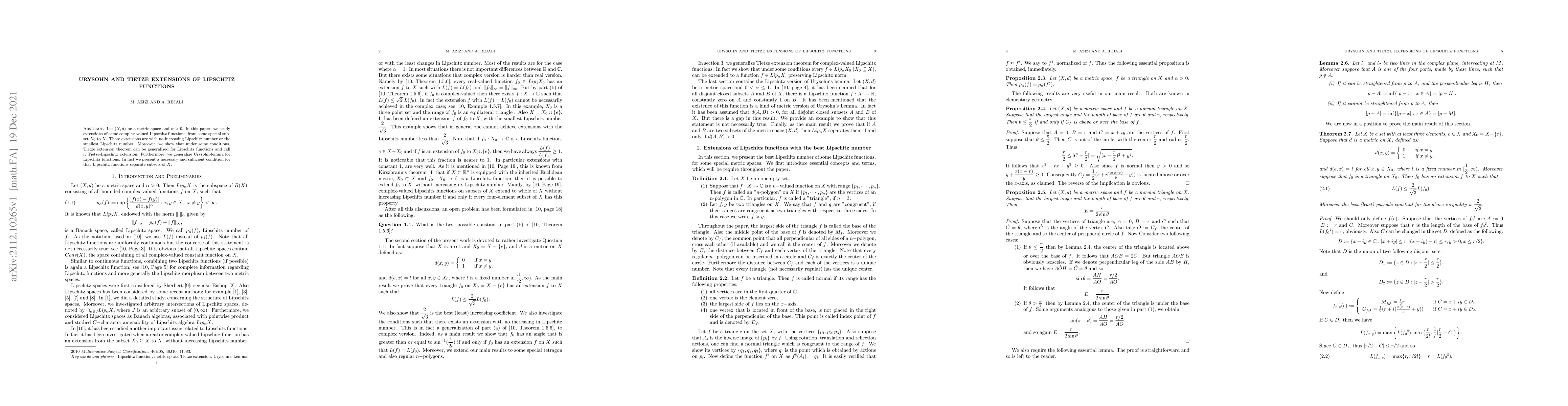 This paper investigates extensions of complex-valued Lipschitz functions from a subset $X_0$ to a metric space $X$, maintaining the Lipschitz number. It generalizes Tietze's extension theorem and Urysohn's lemma for Lipschitz functions, providing a necessary and sufficient condition for Lipschitz functions to separate subsets in $X$.