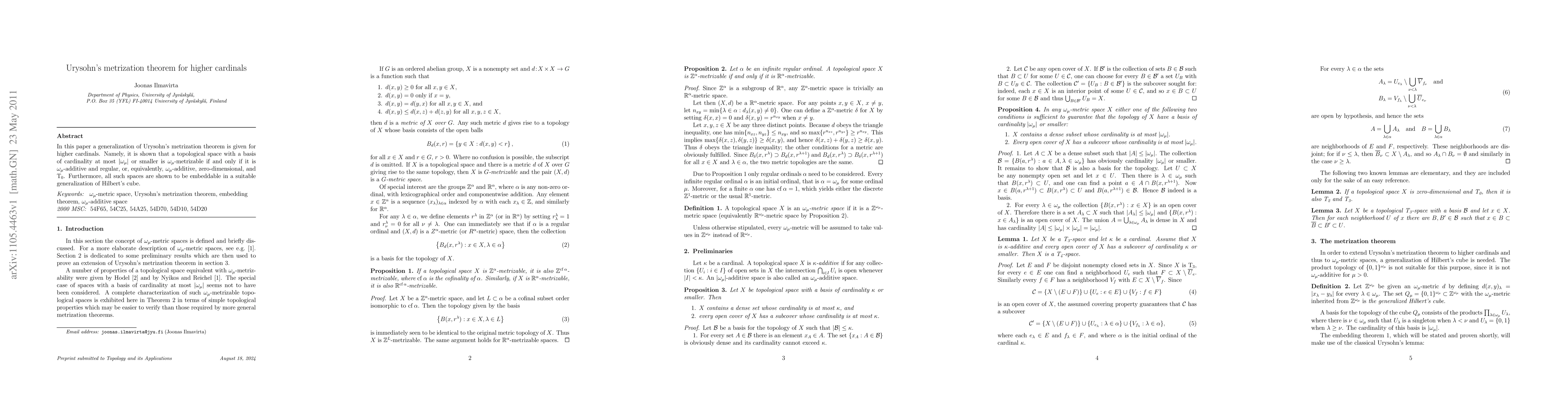 In this paper a generalization of Urysohn's metrization theorem is given for higher cardinals. Namely, it is shown that a topological space with a basis of cardinality at most $|\omega_\mu|$ or smaller is $\omega_\mu$-metrizable if and only if it is $\omega_\mu$-additive and regular, or, equivalently, $\omega_\mu$-additive, zero-dimensional, and T\textsubscript{0}. Furthermore, all such spaces are shown to be embeddable in a suitable generalization of Hilbert's cube.