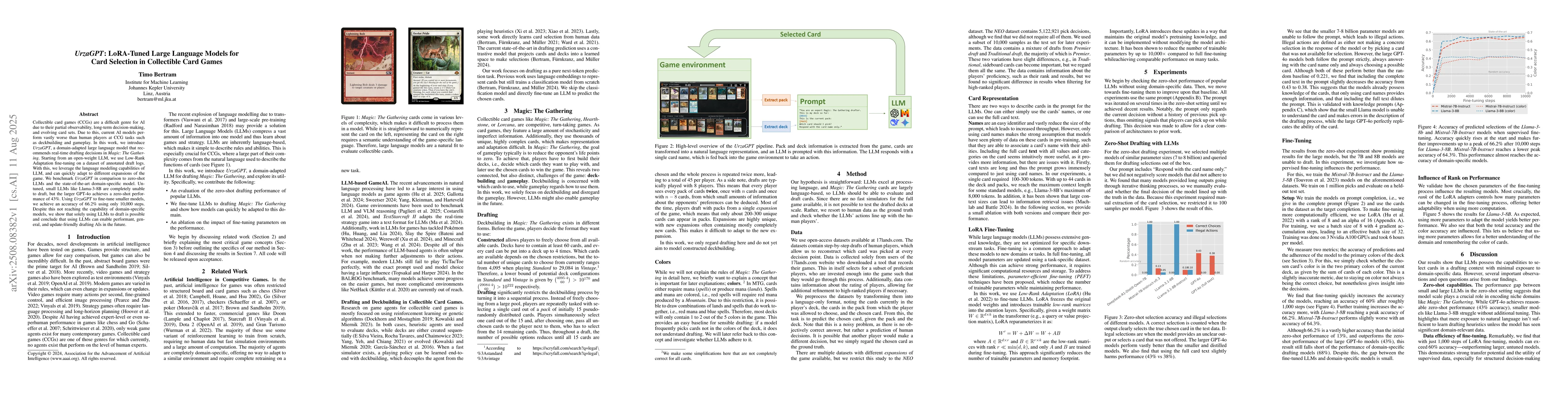 Collectible card games (CCGs) are a difficult genre for AI due to their partial observability, long-term decision-making, and evolving card sets. Due to this, current AI models perform vastly worse than human players at CCG tasks such as deckbuilding and gameplay. In this work, we introduce UrzaGPT, a domain-adapted large language model that recommends real-time drafting decisions in Magic: The Gathering. Starting from an open-weight LLM, we use Low-Rank Adaptation fine-tuning on a dataset of annotated draft logs. With this, we leverage the language modeling capabilities of LLM, and can quickly adapt to different expansions of the game. We benchmark UrzaGPT in comparison to zero-shot LLMs and the state-of-the-art domain-specific model. Untuned, small LLMs like Llama-3-8B are completely unable to draft, but the larger GPT-4o achieves a zero-shot performance of 43%. Using UrzaGPT to fine-tune smaller models, we achieve an accuracy of 66.2% using only 10,000 steps. Despite this not reaching the capability of domain-specific models, we show that solely using LLMs to draft is possible and conclude that using LLMs can enable performant, general, and update-friendly drafting AIs in the future.