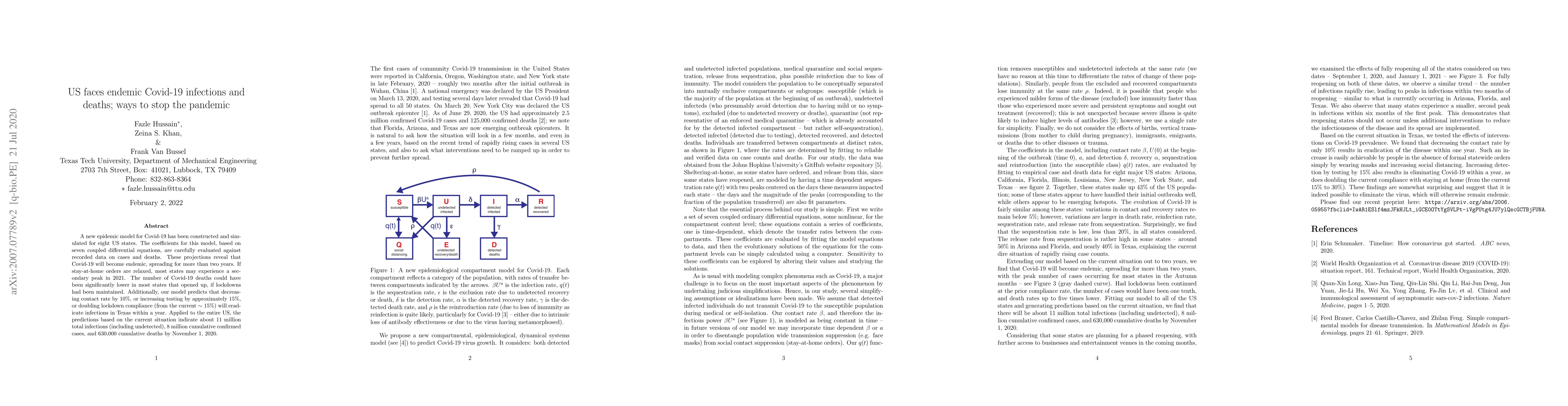 A new epidemic model for Covid-19 has been constructed and simulated for eight US states. The coefficients for this model, based on seven coupled differential equations, are carefully evaluated against recorded data on cases and deaths. These projections reveal that Covid-19 will become endemic, spreading for more than two years. If stay-at-home orders are relaxed, most states may experience a secondary peak in 2021. The number of Covid-19 deaths could have been significantly lower in most states that opened up, if lockdowns had been maintained. Additionally, our model predicts that decreasing contact rate by 10%, or increasing testing by approximately 15%, or doubling lockdown compliance (from the current $\sim$ 15%) will eradicate infections in Texas within a year. Applied to the entire US, the predictions based on the current situation indicate about 11 million total infections (including undetected), 8 million cumulative confirmed cases, and 630,000 cumulative deaths by November 1, 2020.