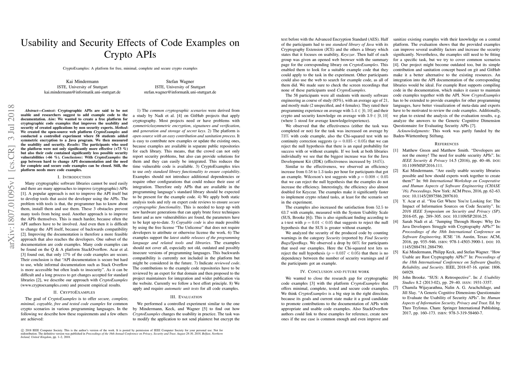 This study developed CryptoExamples, a platform providing free, minimal, and secure cryptographic code examples to improve usability and security for non-security experts. Results from an experiment showed that users of the platform were 73% more effective and had 66% fewer security vulnerabilities in their code compared to controls.