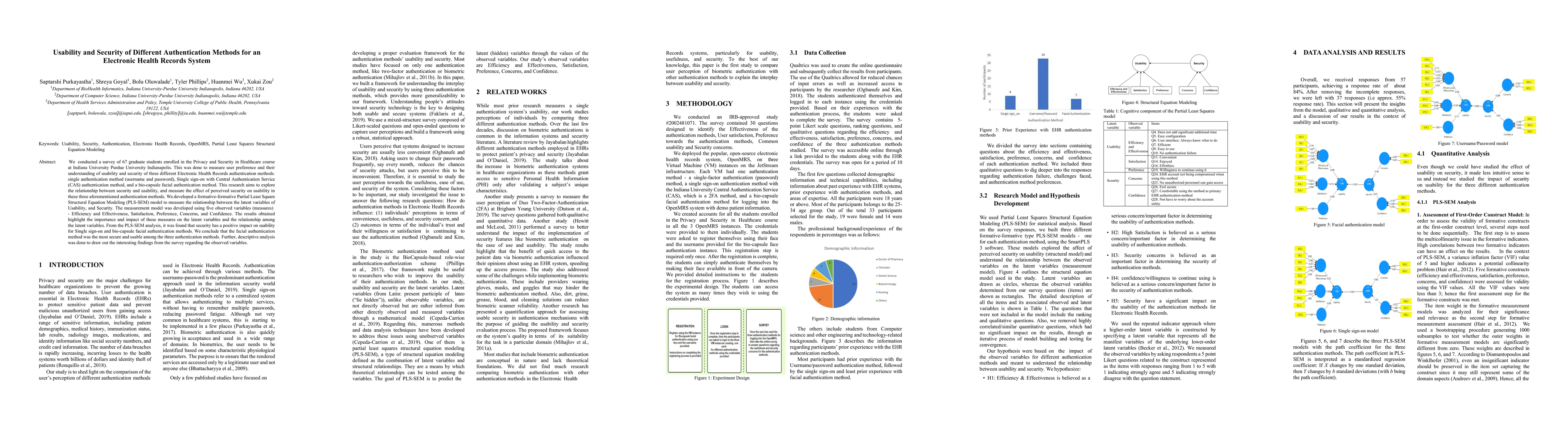 We conducted a survey of 67 graduate students enrolled in the Privacy and Security in Healthcare course at Indiana University Purdue University Indianapolis. This was done to measure user preference and their understanding of usability and security of three different Electronic Health Records authentication methods: single authentication method (username and password), Single sign-on with Central Authentication Service (CAS) authentication method, and a bio-capsule facial authentication method. This research aims to explore the relationship between security and usability, and measure the effect of perceived security on usability in these three aforementioned authentication methods. We developed a formative-formative Partial Least Square Structural Equation Modeling (PLS-SEM) model to measure the relationship between the latent variables of Usability, and Security. The measurement model was developed using five observed variables (measures). - Efficiency and Effectiveness, Satisfaction, Preference, Concerns, and Confidence. The results obtained highlight the importance and impact of these measures on the latent variables and the relationship among the latent variables. From the PLS-SEM analysis, it was found that security has a positive impact on usability for Single sign-on and bio-capsule facial authentication methods. We conclude that the facial authentication method was the most secure and usable among the three authentication methods. Further, descriptive analysis was done to draw out the interesting findings from the survey regarding the observed variables.