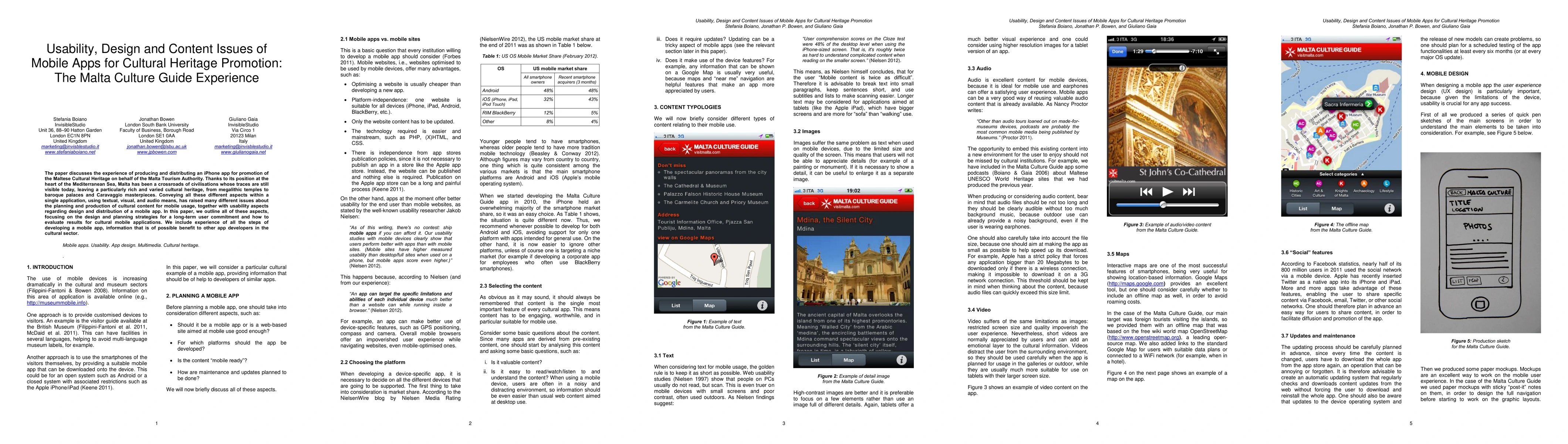 The paper discusses the experience of producing and distributing an iPhone app for promotion of the Maltese Cultural Heritage on behalf of the Malta Tourism Authority. Thanks to its position at the heart of the Mediterranean Sea, Malta has been a crossroads of civilisations whose traces are still visible today, leaving a particularly rich and varied cultural heritage, from megalithic temples to baroque palaces and Caravaggio masterpieces. Conveying all these different aspects within a single application, using textual, visual, and audio means, has raised many different issues about the planning and production of cultural content for mobile usage, together with usability aspects regarding design and distribution of a mobile app. In this paper, we outline all of these aspects, focusing on the design and planning strategies for a long-term user commitment and how to evaluate results for cultural mobile applications. We include experience of all the steps of developing a mobile app, information that is of possible benefit to other app developers in the cultural sector.