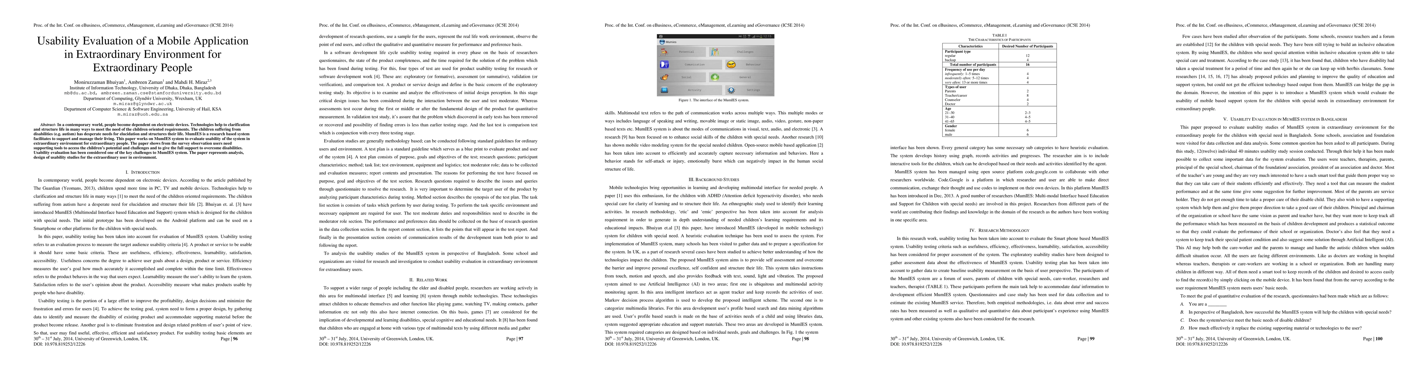 This paper evaluates the usability of the MumIES mobile application designed to support children with disabilities, particularly autism, by analyzing user needs and challenges in extraordinary environments. The study highlights the importance of usability evaluation to provide effective tools for overcoming the children's potential and disability challenges.