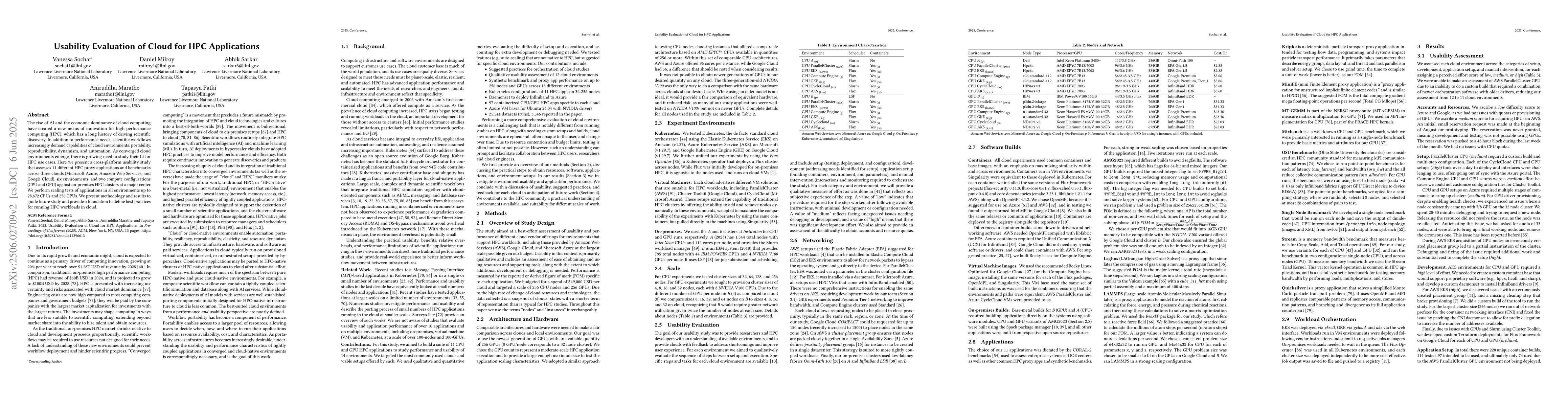 The study employs a cross-platform usability evaluation, assessing 11 HPC proxy applications and benchmarks across three cloud providers (Azure, AWS, Google Cloud), six environments, and two compute configurations (CPU, GPU). Scaling tests are conducted up to 28,672 CPUs and 256 GPUs, comparing performance against on-premises HPC clusters.
