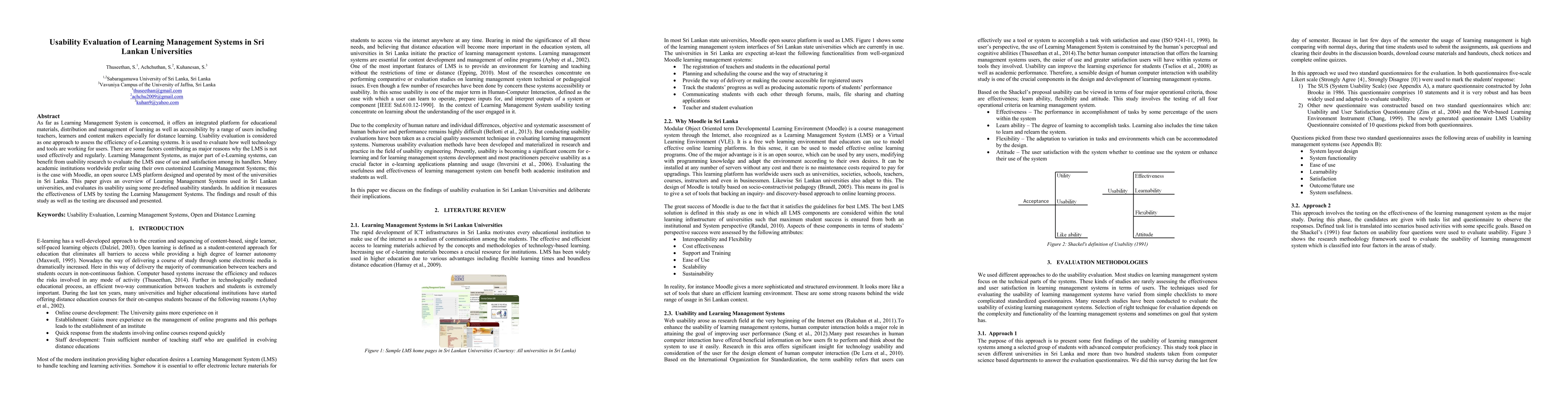 This paper evaluates the usability of Learning Management Systems (LMS) in Sri Lankan universities, focusing on Moodle, and assesses their effectiveness against predefined usability standards. The study discusses findings on factors hindering effective LMS use and presents results from usability testing.