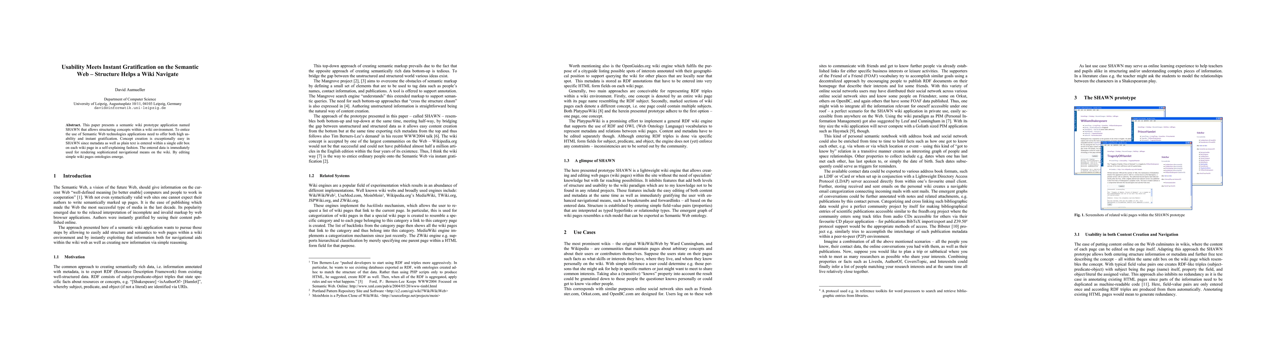 This paper presents a semantic wiki prototype application named SHAWN [later WikSAR] that allows structuring concepts within a wiki environment. To entice the use of Semantic Web technologies applications need to offer both high usability and instant gratification. Concept creation is exceptionally easy in SHAWN since metadata as well as plain text is entered within a single edit box on each wiki page in a self-explaining fashion. The entered data is immediately used for rendering sophisticated navigational means on the wiki. By editing simple wiki pages ontologies emerge.