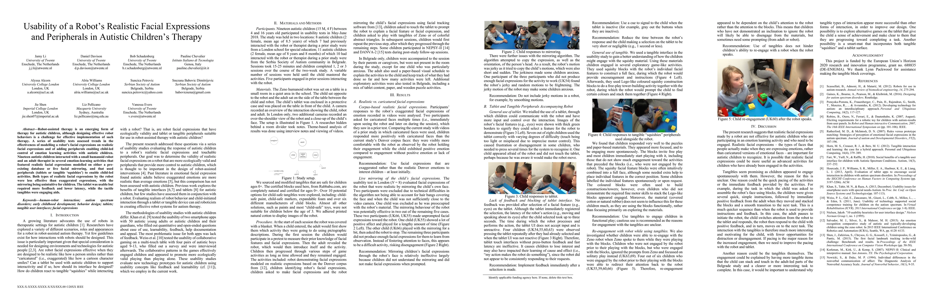 This study investigates the usability of a robot's facial expressions and peripherals in therapy for autistic children. Realistic facial expressions were less effective than exaggerated ones, and while tablets were usable, they needed better feedback and lower latency, whereas tactile aids were engaging.