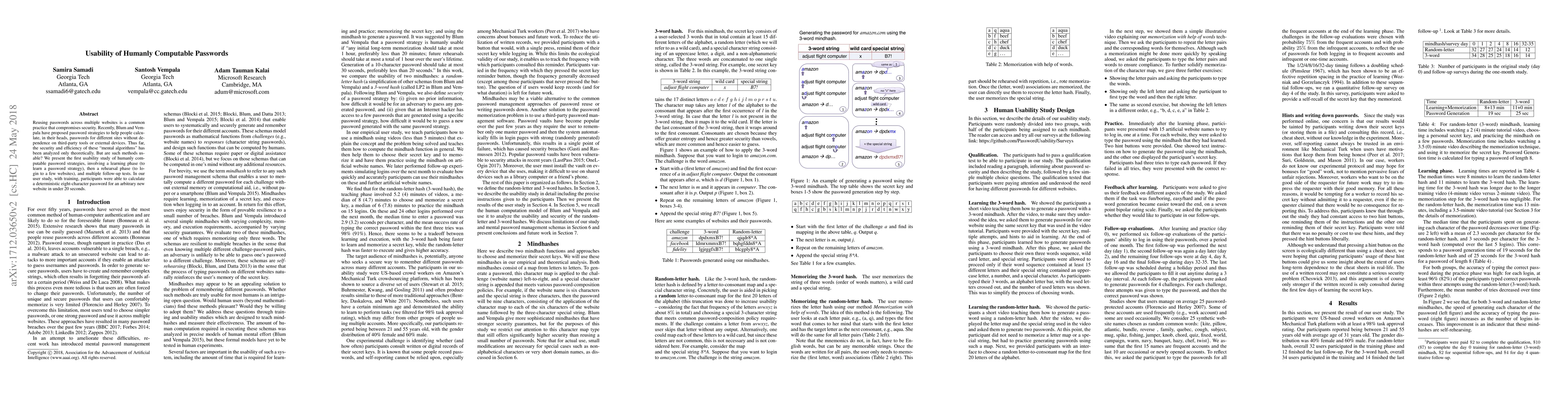 This paper presents the first usability study on humanly computable password strategies, finding that with training, participants can generate a secure eight-character password for new websites in under 20 seconds, demonstrating the practical feasibility of these mental algorithms. The study highlights the potential to enhance both security and usability through such strategies.