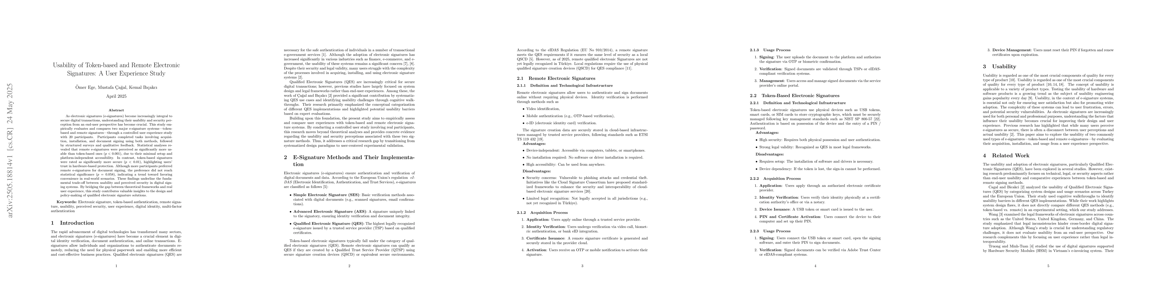 Remote electronic signatures were perceived as more usable than token-based ones due to minimal setup and accessibility, while token-based signatures were rated more secure with hardware protection.