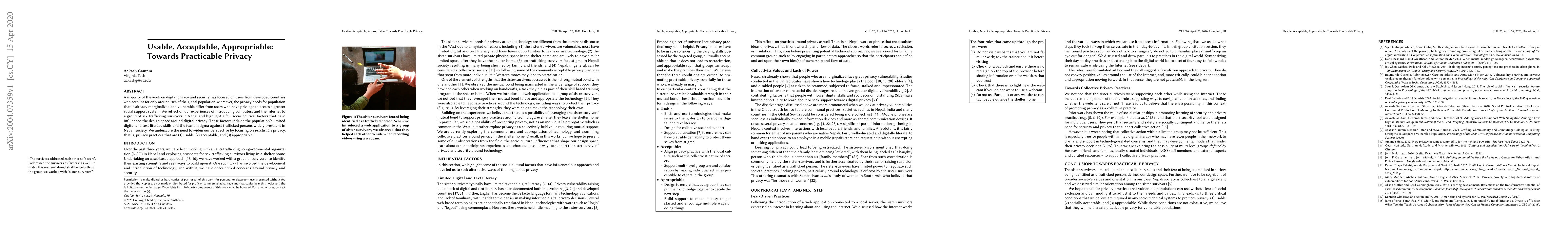 This paper explores digital privacy needs for marginalized populations, using sex-trafficking survivors in Nepal as a case study. It emphasizes the importance of designing privacy practices that are usable, acceptable, and appropriable, considering socio-political factors like low digital literacy and societal stigma.