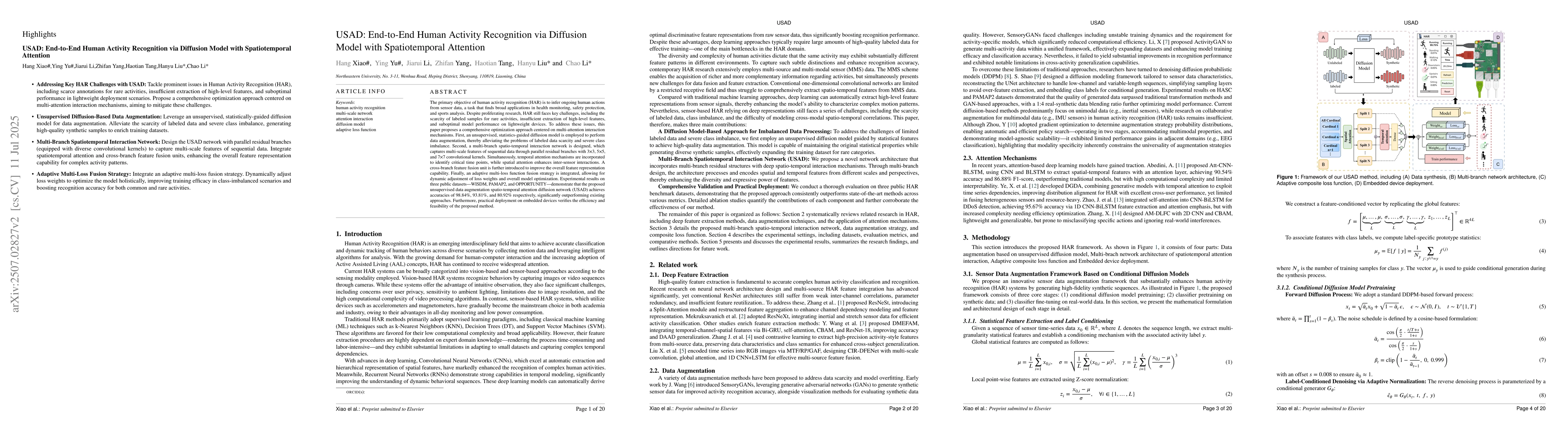 This research introduces USAD, a novel method for human activity recognition (HAR) using an unsupervised data augmentation technique and a multi-attention spatio-temporal interaction network. USAD tackles HAR challenges like limited labeled data and feature extraction inefficiency, achieving high accuracy (98.84%, 93.81%, and 80.92% on WISDM, PAMAP2, and OPPORTUNITY datasets, respectively) and proving efficient for embedded device deployment.