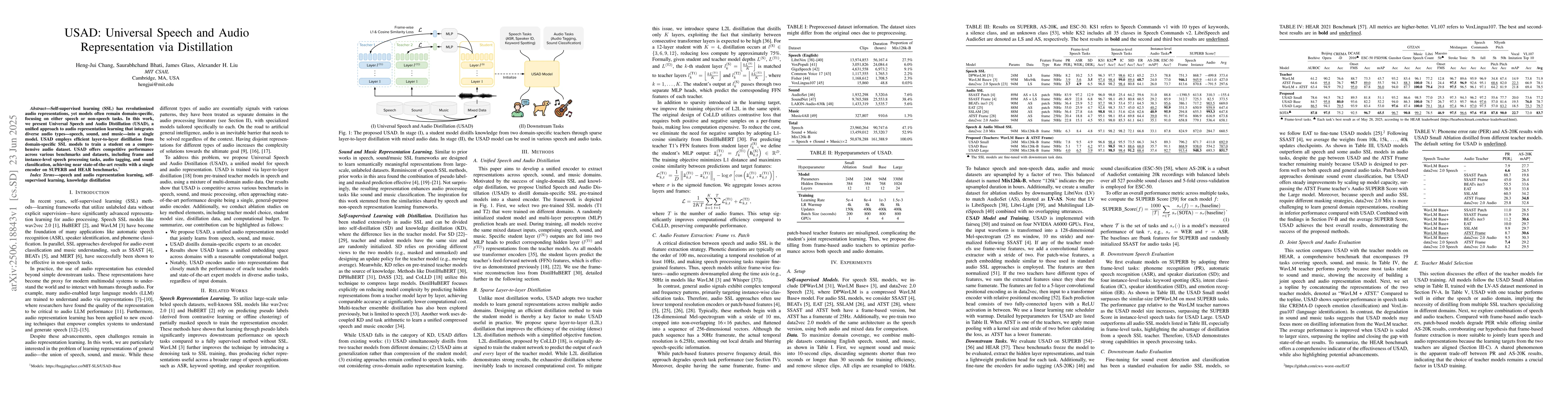 Self-supervised learning (SSL) has revolutionized audio representations, yet models often remain domain-specific, focusing on either speech or non-speech tasks. In this work, we present Universal Speech and Audio Distillation (USAD), a unified approach to audio representation learning that integrates diverse audio types - speech, sound, and music - into a single model. USAD employs efficient layer-to-layer distillation from domain-specific SSL models to train a student on a comprehensive audio dataset. USAD offers competitive performance across various benchmarks and datasets, including frame and instance-level speech processing tasks, audio tagging, and sound classification, achieving near state-of-the-art results with a single encoder on SUPERB and HEAR benchmarks.