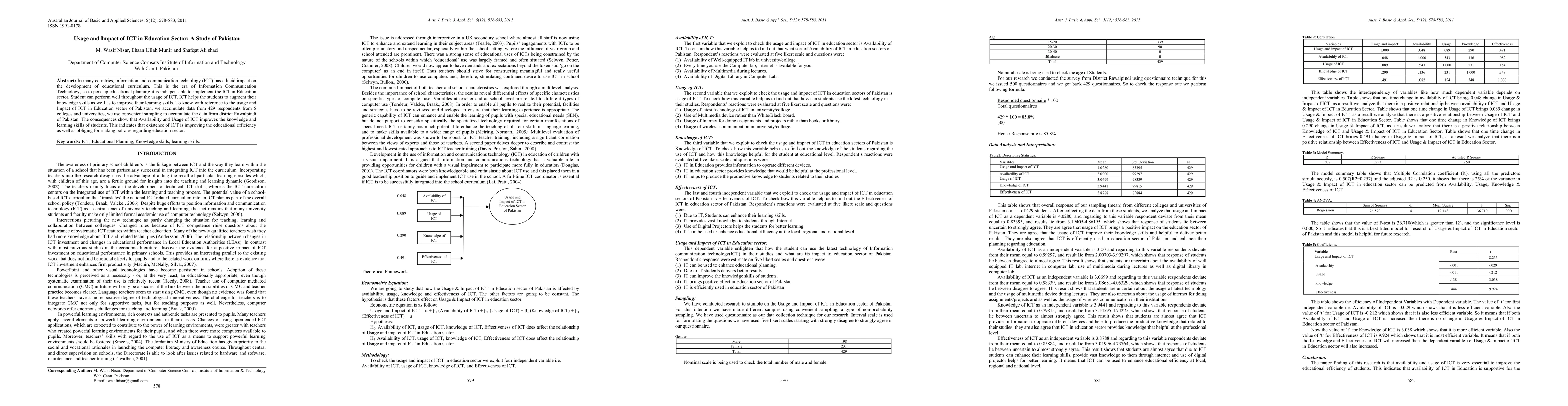 This study investigates the usage and impact of ICT in Pakistan's education sector, finding that its availability and use enhance students' knowledge and learning skills. Data from 429 respondents in Rawalpindi indicates that ICT improves educational efficiency and informs policy-making.