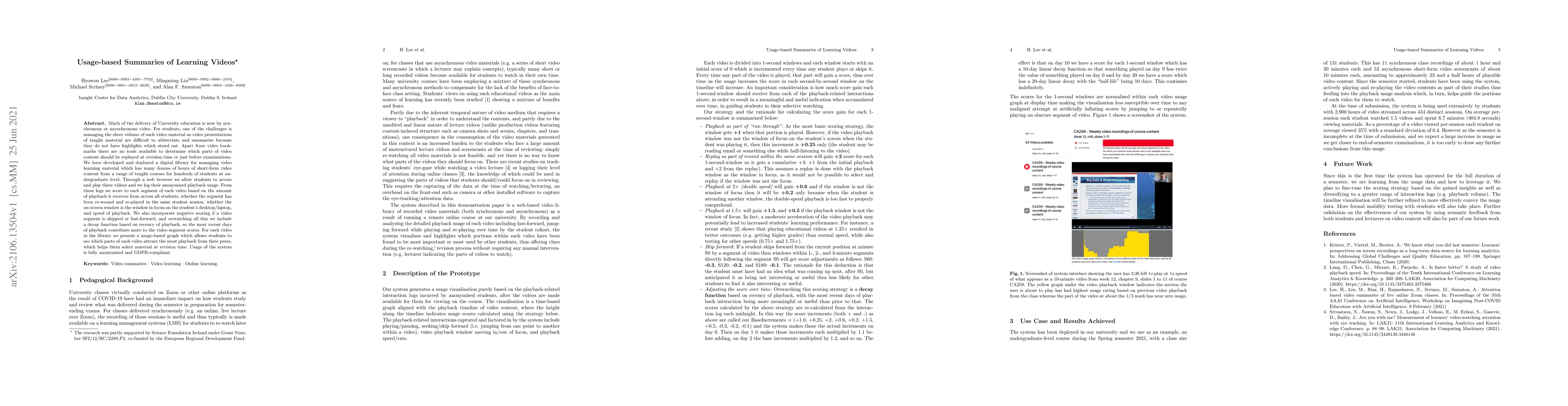 Much of the delivery of University education is now by synchronous or asynchronous video. For students, one of the challenges is managing the sheer volume of such video material as video presentations of taught material are difficult to abbreviate and summarise because they do not have highlights which stand out. Apart from video bookmarks there are no tools available to determine which parts of video content should be replayed at revision time or just before examinations. We have developed and deployed a digital library for managing video learning material which has many dozens of hours of short-form video content from a range of taught courses for hundreds of students at undergraduate level. Through a web browser we allow students to access and play these videos and we log their anonymised playback usage. From these logs we score to each segment of each video based on the amount of playback it receives from across all students, whether the segment has been re-wound and re-played in the same student session, whether the on-screen window is the window in focus on the student's desktop/laptop, and speed of playback. We also incorporate negative scoring if a video segment is skipped or fast-forward, and overarching all this we include a decay function based on recency of playback, so the most recent days of playback contribute more to the video segment scores. For each video in the library we present a usage-based graph which allows students to see which parts of each video attract the most playback from their peers, which helps them select material at revision time. Usage of the system is fully anonymised and GDPR-compliant.