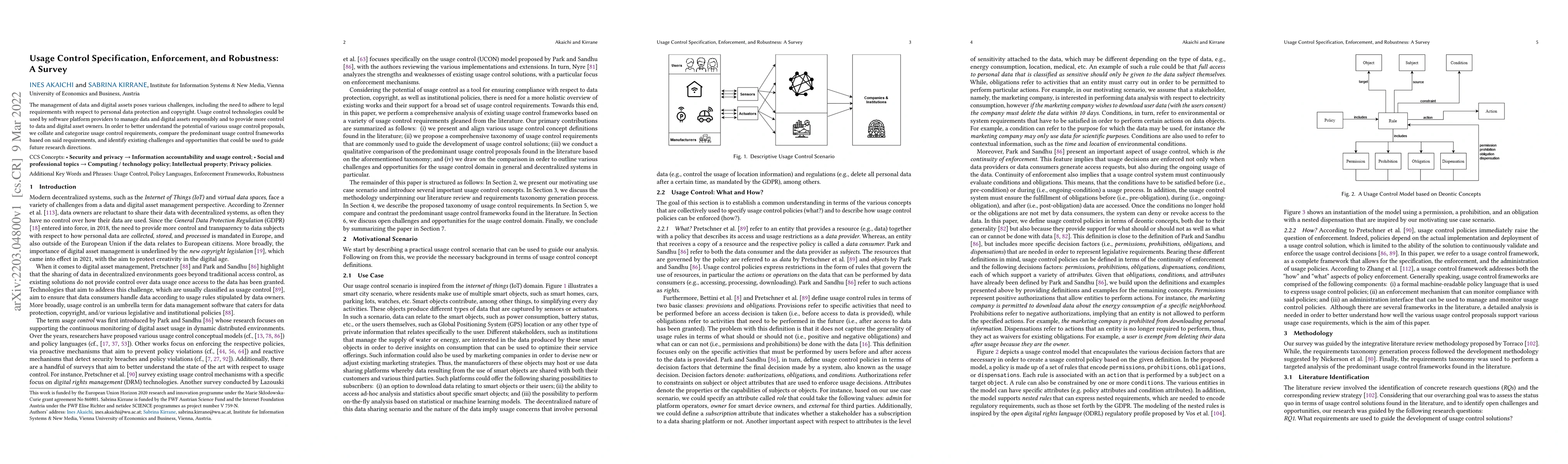 This survey offers a holistic view of usage control proposals, specifications, enforcement, and robustness, which is not extensively covered in a single source, guiding future research directions.