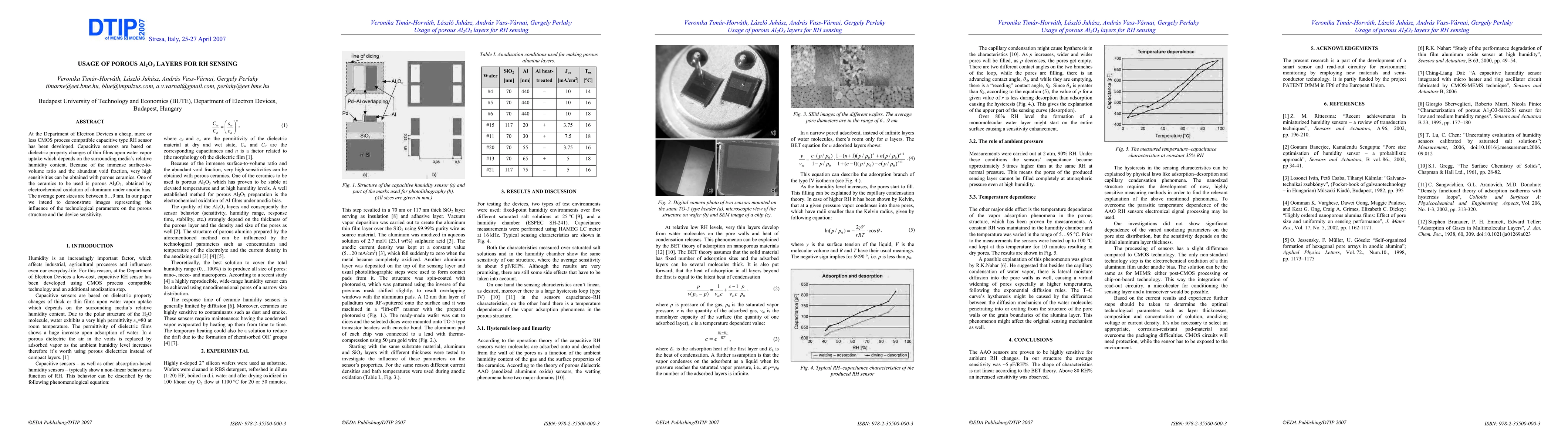 At the Department of Electron Devices a cheap, more or less CMOS process compatible capacitive type RH sensor has been developed. Capacitive sensors are based on dielectric property changes of thin films upon water vapour uptake which depends on the surrounding media's relative humidity content. Because of the immense surface-to-volume ratio and the abundant void fraction, very high sensitivities can be obtained with porous ceramics. One of the ceramics to be used is porous Al2O3, obtained by electrochemical oxidation of aluminium under anodic bias. The average pore sizes are between 6...9 nm. In our paper we intend to demonstrate images representing the influence of the technological parameters on the porous structure and the device sensitivity.