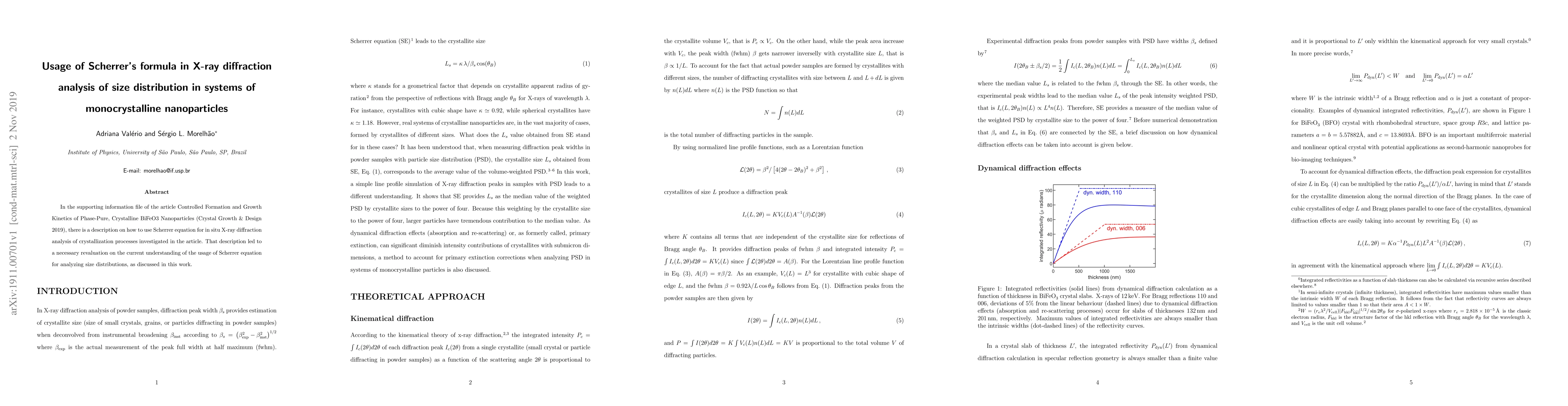 In the supporting information file of the article Controlled Formation and Growth Kinetics of Phase-Pure, Crystalline BiFeO3 Nanoparticles (Crystal Growth & Design 2019), there is a description on how to use Scherrer equation for in situ X-ray diffraction analysis of crystallization processes investigated in the article. That description led to a necessary revaluation on the current understanding of the usage of Scherrer equation for analyzing size distributions, as discussed in this work.