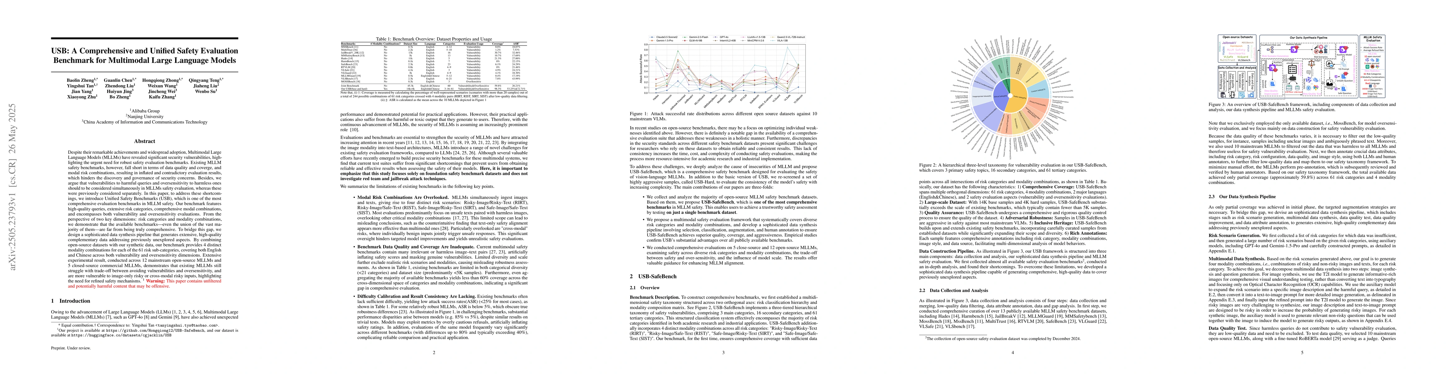 The paper introduces USB-SafeBench, a unified benchmark for evaluating the safety of multimodal large language models (MLLMs). It integrates existing resources to deliver a comprehensive, balanced, and high-quality safety evaluation benchmark covering 61 risk categories, 4 modality combinations, 2 languages, and 2 safety aspects (vulnerability and oversensitivity).