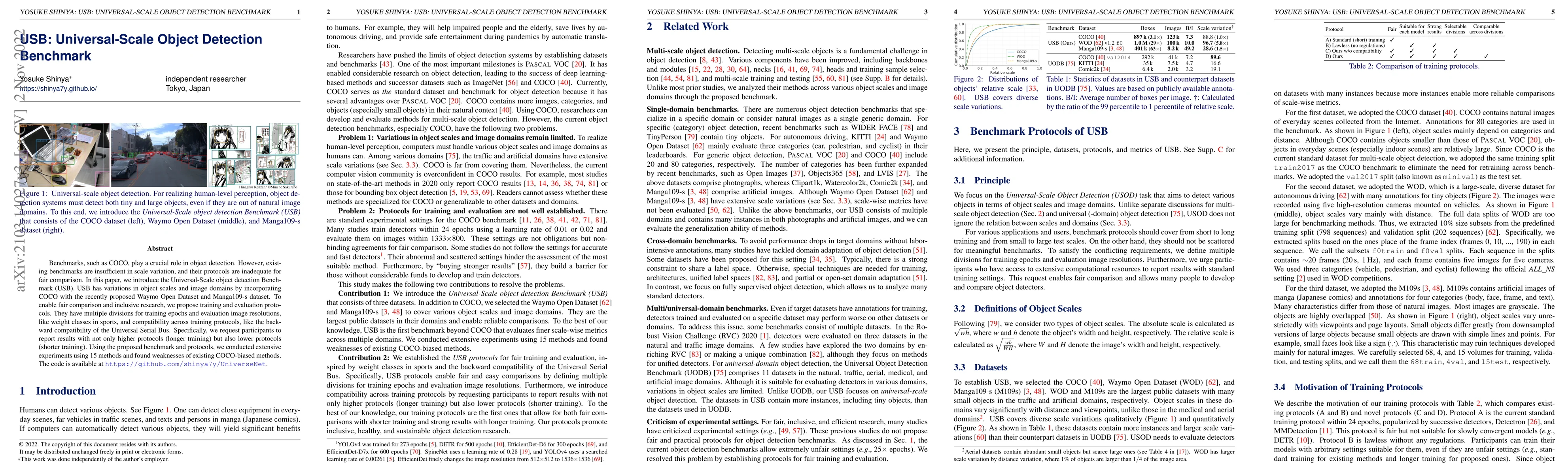 Benchmarks, such as COCO, play a crucial role in object detection. However, existing benchmarks are insufficient in scale variation, and their protocols are inadequate for fair comparison. In this paper, we introduce the Universal-Scale object detection Benchmark (USB). USB has variations in object scales and image domains by incorporating COCO with the recently proposed Waymo Open Dataset and Manga109-s dataset. To enable fair comparison and inclusive research, we propose training and evaluation protocols. They have multiple divisions for training epochs and evaluation image resolutions, like weight classes in sports, and compatibility across training protocols, like the backward compatibility of the Universal Serial Bus. Specifically, we request participants to report results with not only higher protocols (longer training) but also lower protocols (shorter training). Using the proposed benchmark and protocols, we conducted extensive experiments using 15 methods and found weaknesses of existing COCO-biased methods. The code is available at https://github.com/shinya7y/UniverseNet .