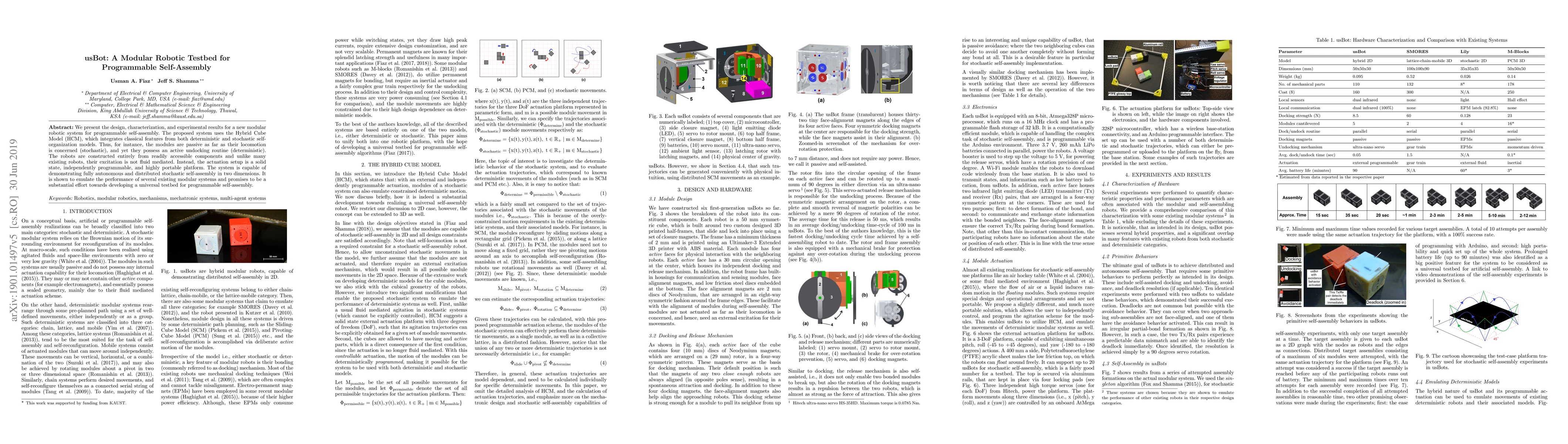 A modular robotic system using the Hybrid Cube Model for programmable self-assembly is presented, featuring a solid-state, independently programmable actuation setup. The system demonstrates autonomous and distributed stochastic self-assembly in two dimensions, promising to serve as a universal testbed for such processes.