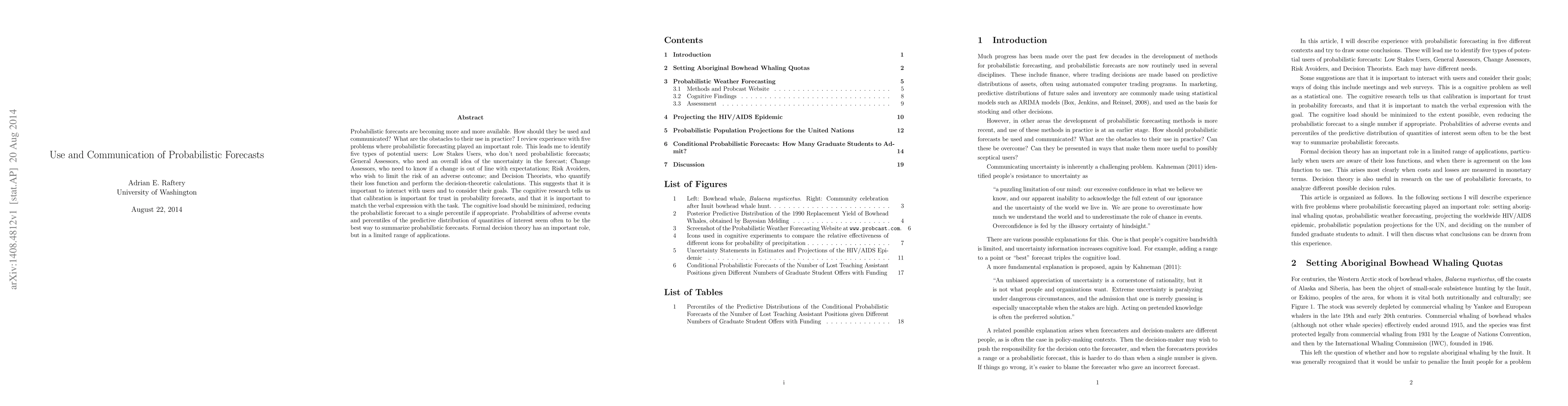 Probabilistic forecasts are becoming more and more available. How should they be used and communicated? What are the obstacles to their use in practice? I review experience with five problems where probabilistic forecasting played an important role. This leads me to identify five types of potential users: Low Stakes Users, who don't need probabilistic forecasts; General Assessors, who need an overall idea of the uncertainty in the forecast; Change Assessors, who need to know if a change is out of line with expectatations; Risk Avoiders, who wish to limit the risk of an adverse outcome; and Decision Theorists, who quantify their loss function and perform the decision-theoretic calculations. This suggests that it is important to interact with users and to consider their goals. The cognitive research tells us that calibration is important for trust in probability forecasts, and that it is important to match the verbal expression with the task. The cognitive load should be minimized, reducing the probabilistic forecast to a single percentile if appropriate. Probabilities of adverse events and percentiles of the predictive distribution of quantities of interest seem often to be the best way to summarize probabilistic forecasts. Formal decision theory has an important role, but in a limited range of applications.
