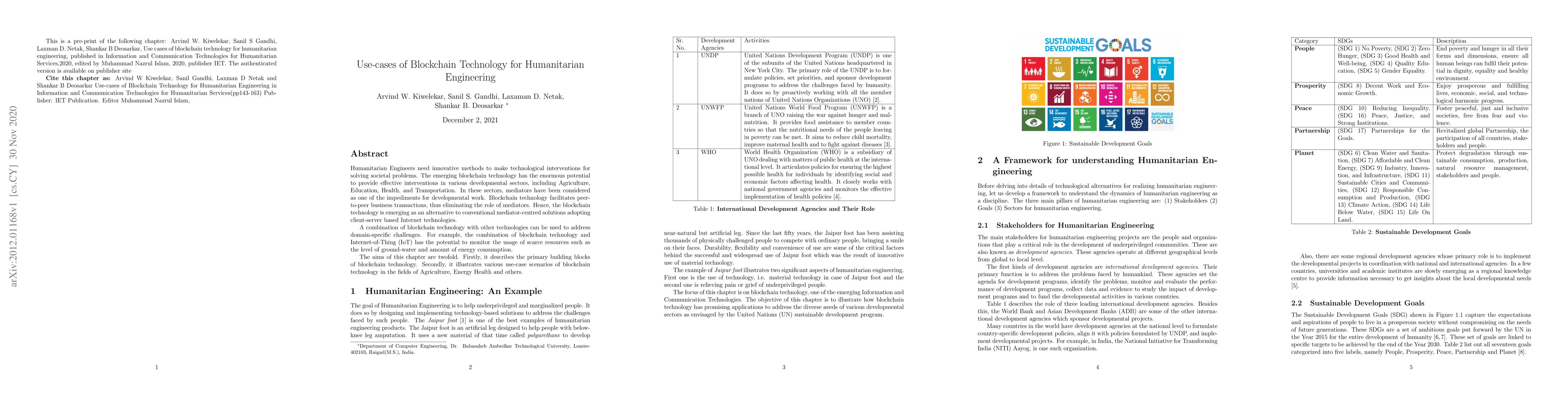 Humanitarian Engineers need innovative methods to make technological interventions for solving societal problems. The emerging blockchain technology has the enormous potential to provide effective interventions in various developmental sectors, including Agriculture, Education, Health, and Transportation. In these sectors, mediators have been considered as one of the impediments for developmental work. Blockchain technology facilitates peer-to-peer business transactions, thus eliminating the role of mediators. Hence, the blockchain technology is emerging as an alternative to conventional mediator-centred solutions adopting client-server based Internet technologies. A combination of blockchain technology with other technologies can be used to address domain-specific challenges. For example, the combination of blockchain technology and Internet-of-Thing (IoT) has the potential to monitor the usage of scarce resources such as the level of ground-water and amount of energy consumption. The aims of this chapter are twofold. Firstly, it describes the primary building blocks of blockchain technology. Secondly, it illustrates various use-case scenarios of blockchain technology in the fields of Agriculture, Energy Health and others.