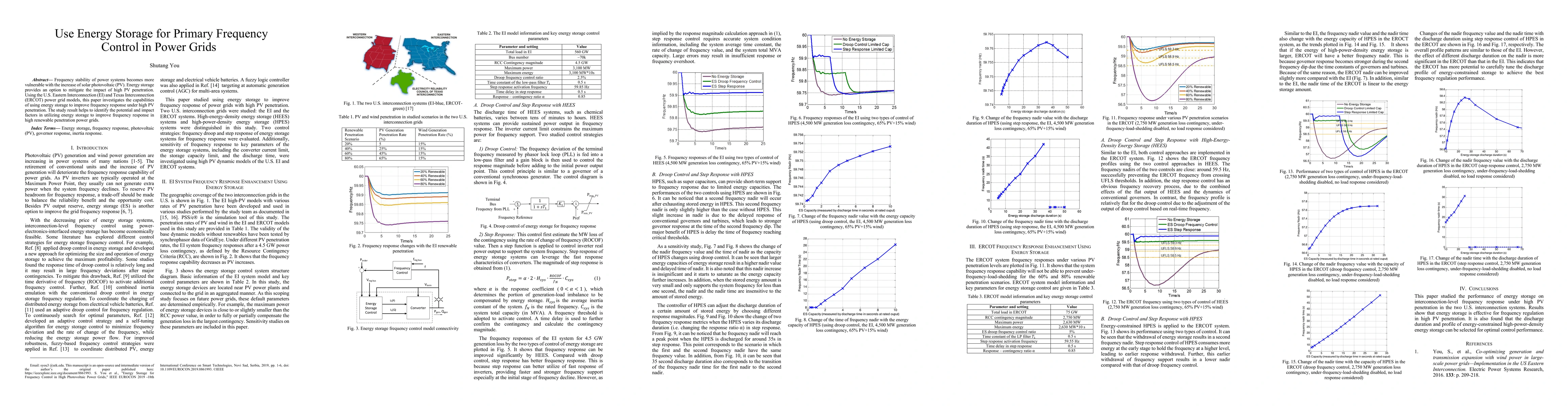 This paper explores the use of energy storage systems to enhance primary frequency control in power grids with high solar photovoltaic penetration, using models of the U.S. Eastern and Texas interconnections. It identifies potential benefits and factors influencing the effectiveness of energy storage in maintaining frequency stability.