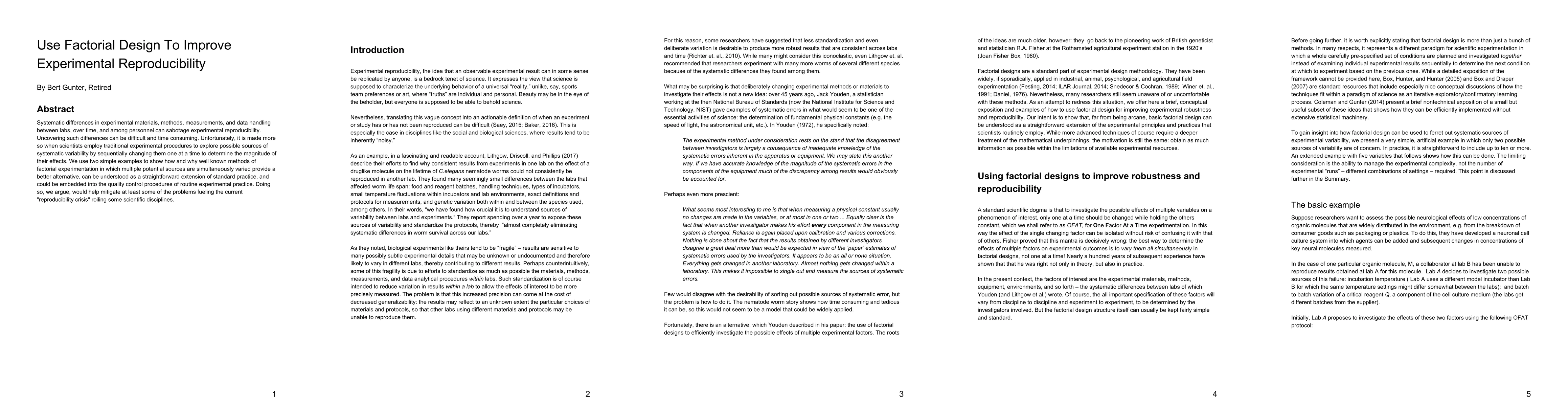While factorial designs are well-established in statistics, this paper emphasizes their importance and practical application for improving experimental reproducibility, presenting them as a solution to the current reproducibility crisis in various scientific disciplines.