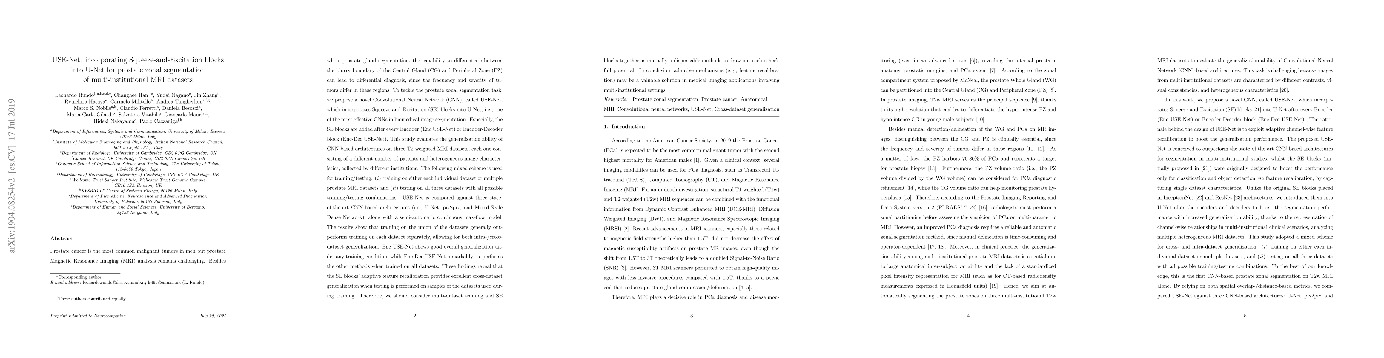 USE-Net, a novel CNN incorporating Squeeze-and-Excitation blocks into U-Net, enhances prostate zonal segmentation in MRI. It demonstrates superior generalization across multi-institutional datasets compared to U-Net, pix2pix, and Mixed-Scale Dense Network, especially when trained on combined datasets.