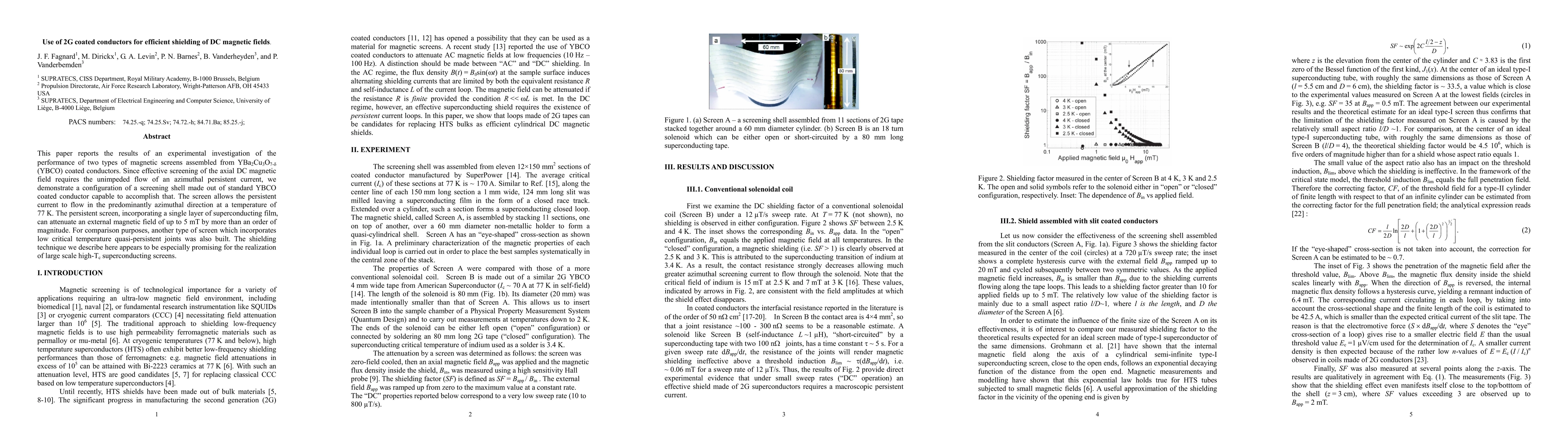 This paper reports the results of an experimental investigation of the performance of two types of magnetic screens assembled from YBa2Cu3O7-d (YBCO) coated conductors. Since effective screening of the axial DC magnetic field requires the unimpeded flow of an azimuthal persistent current, we demonstrate a configuration of a screening shell made out of standard YBCO coated conductor capable to accomplish that. The screen allows the persistent current to flow in the predominantly azimuthal direction at a temperature of 77 K. The persistent screen, incorporating a single layer of superconducting film, can attenuate an external magnetic field of up to 5 mT by more than an order of magnitude. For comparison purposes, another type of screen which incorporates low critical temperature quasi-persistent joints was also built. The shielding technique we describe here appears to be especially promising for the realization of large scale high-Tc superconducting screens.