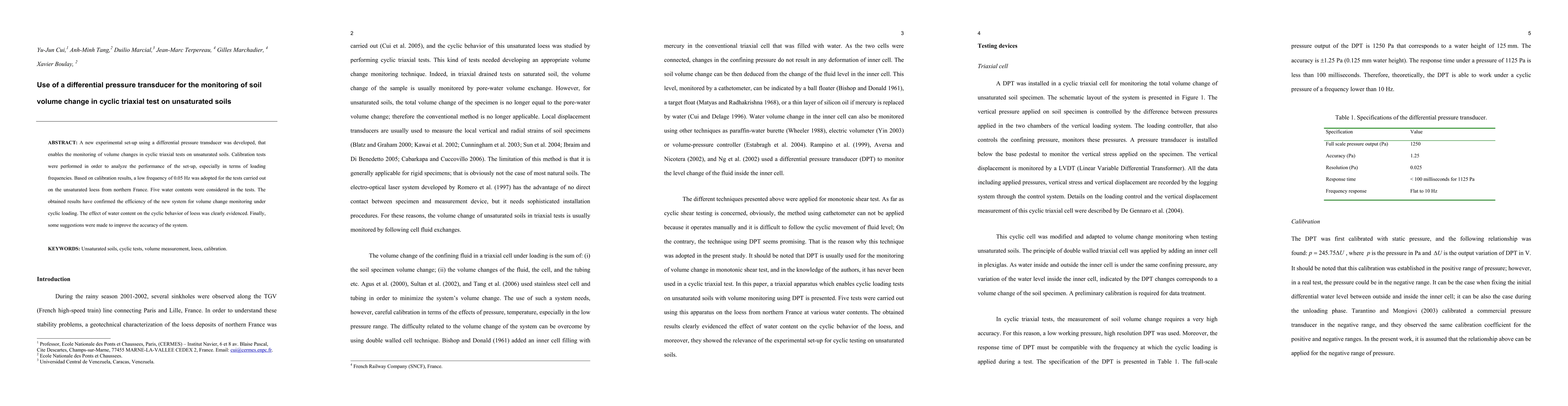 A new experimental set-up using a differential pressure transducer was developed, that enables the monitoring of volume changes in cyclic triaxial tests on unsaturated soils. Calibration tests were performed in order to analyze the performance of the set-up, especially in terms of loading frequencies. Based on calibration results, a low frequency of 0.05 Hz was adopted for the tests carried out on the unsaturated loess from northern France. Five water contents were considered in the tests. The obtained results have confirmed the efficiency of the new system for volume change monitoring under cyclic loading. The effect of water content on the cyclic behavior of loess was clearly evidenced. Finally, some suggestions were made to improve the accuracy of the system.