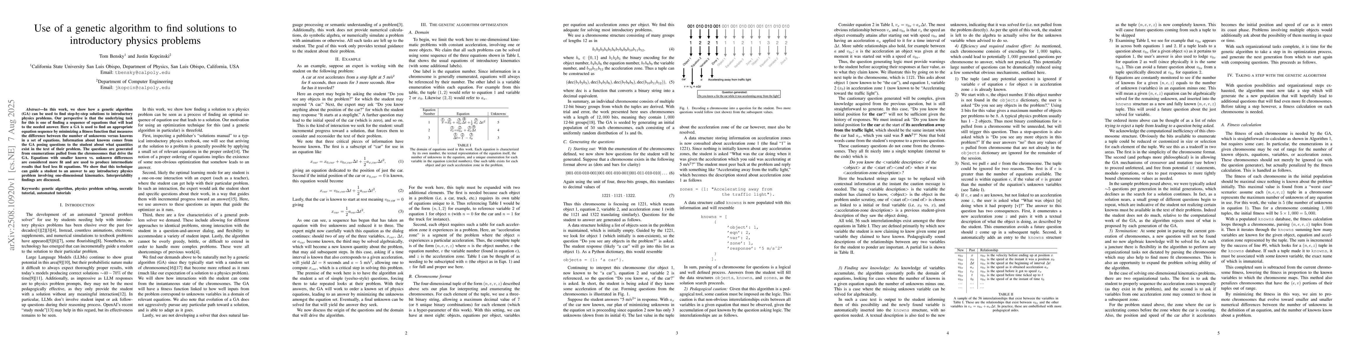 In this work, we show how a genetic algorithm (GA) can be used to find step-by-step solutions to introductory physics problems. Our perspective is that the underlying task for this is one of finding a sequence of equations that will lead to the needed answer. Here a GA is used to find an appropriate equation sequence by minimizing a fitness function that measures the difference between the number of unknowns versus knowns in a set of equations. Information about knowns comes from the GA posing questions to the student about what quantities exist in the text of their problem. The questions are generated from enumerations pulled from the chromosomes that drive the GA. Equations with smaller known vs. unknown differences are considered more fit and are used to produce intermediate results that feed less fit equations. We show that this technique can guide a student to an answer to any introductory physics problem involving one-dimensional kinematics. Interpretability findings are discussed.