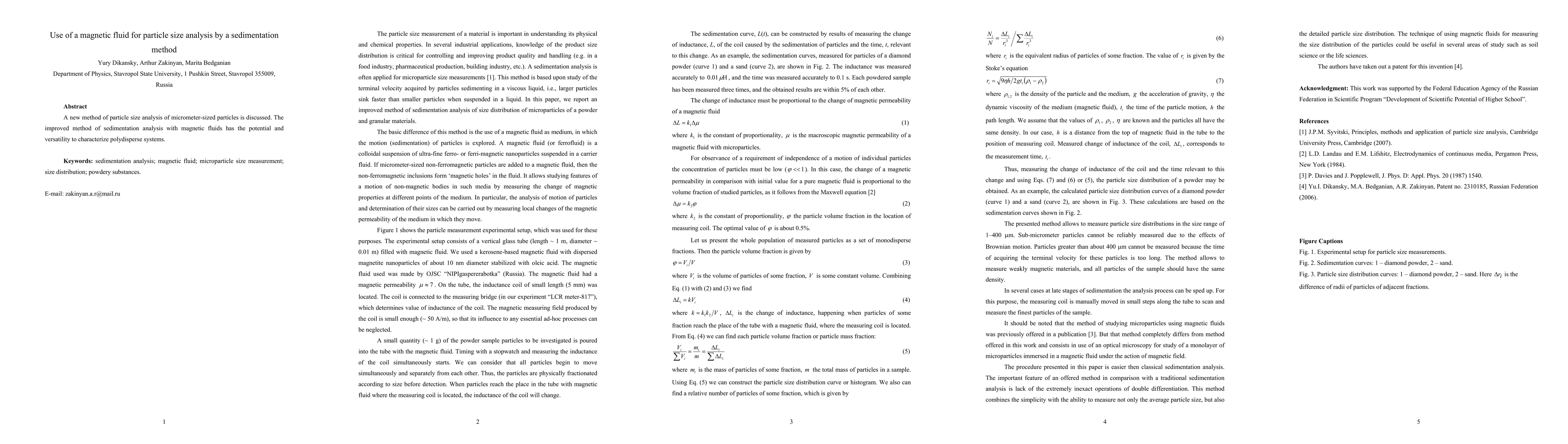 Summary: This paper introduces a novel method for particle size analysis using magnetic fluids in sedimentation, demonstrating its potential to effectively characterize polydisperse systems. The technique offers improved versatility and accuracy for micrometer-sized particles.