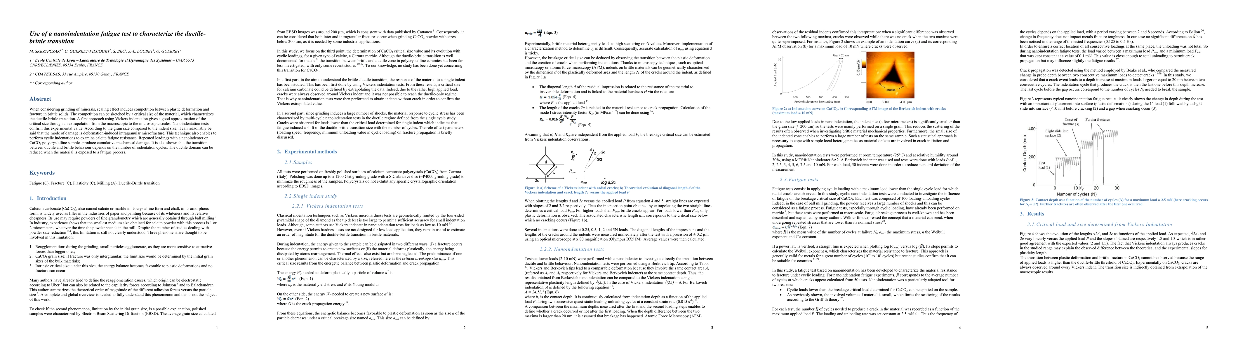 This study employs nanoindentation fatigue tests to characterize the ductile-brittle transition in minerals, demonstrating that repeated loading induces cumulative mechanical damage and shifts the transition based on the number of cycles. The technique reveals deformation-induced intragranular microfracture and calcite's fatigue resistance.