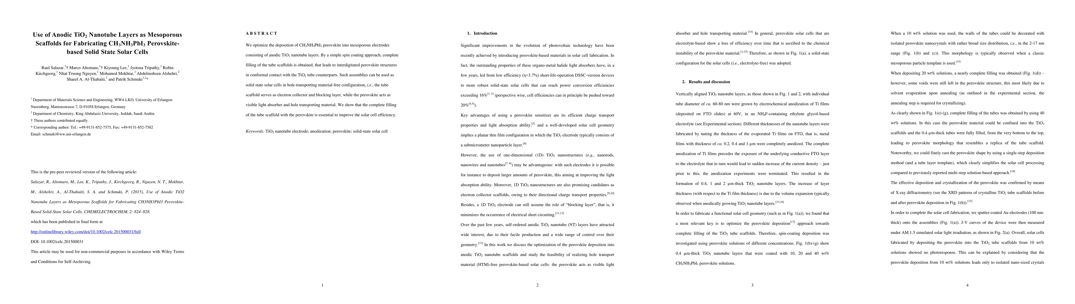 This paper optimizes the deposition of CH3NH3PbI3 perovskite into anodic TiO2 nanotube layers for solid-state solar cells, achieving complete filling via spin coating. The resulting interdigitated perovskite structures enhance solar cell efficiency by eliminating the need for hole-transporting materials.