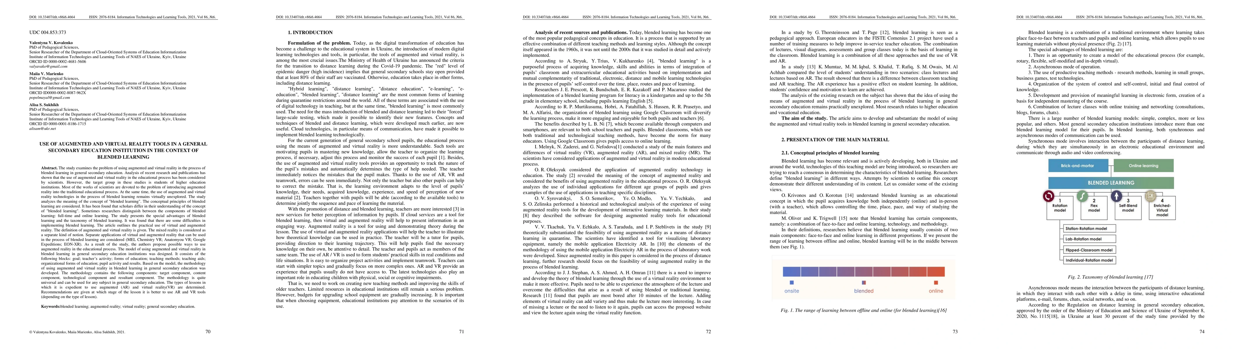 The study examines the problem of using augmented and virtual reality in the process of blended learning in general secondary education. The study analyzes the meaning of the concept of "blended learning". The conceptual principles of blended learning are considered. The definition of augmented and virtual reality is given. The mixed reality is considered as a separate kind of notion. Separate applications of virtual and augmented reality that can be used in the process of blended learning are considered. As a result of the study, the authors propose possible ways to use augmented reality in the educational process. The model of using augmented and virtual reality in blended learning in general secondary education institutions was designed. It consists of the following blocks: goal; teacher's activity; forms of education; teaching methods; teaching aids; organizational forms of education; pupil activity and results. Based on the model, the methodology of using augmented and virtual reality in blended learning in general secondary education was developed. The methodology contains the following components: target component, content component, technological component and resultant component. The methodology is quite universal and can be used for any subject in general secondary education. The types of lessons in which it is expedient to use augmented (AR) and virtual reality(VR) are determined. Recommendations are given at which stage of the lesson it is better to use AR and VR tools (depending on the type of lesson).
