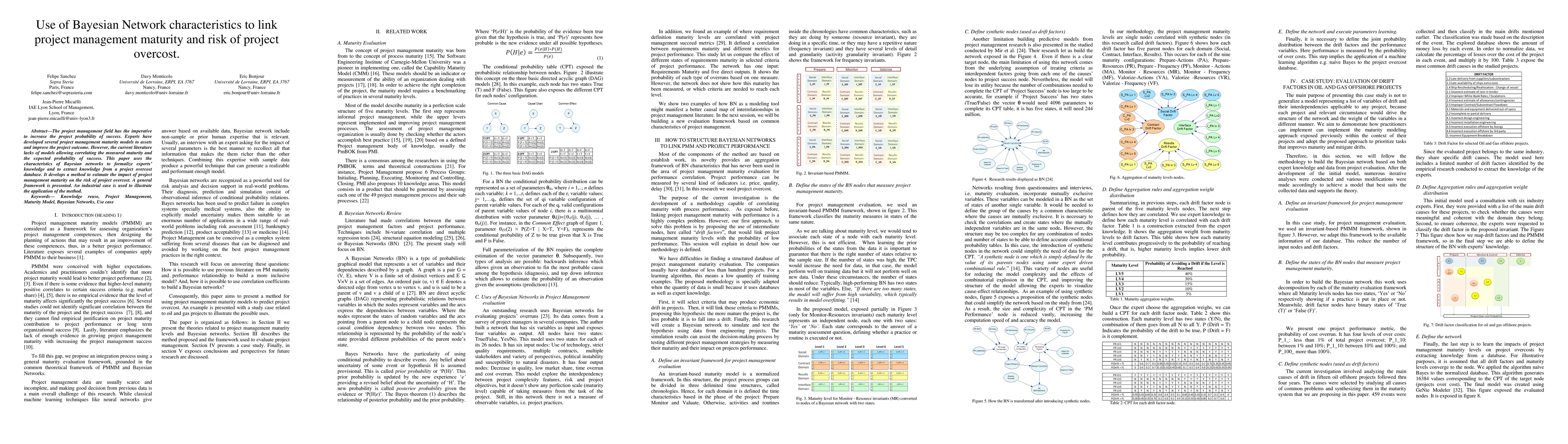 The project management field has the imperative to increase the project probability of success. Experts have developed several project management maturity models to assets and improve the project outcome. However, the current literature lacks of models allowing correlating the measured maturity and the expected probability of success. This paper uses the characteristics of Bayesian networks to formalize experts' knowledge and to extract knowledge from a project overcost database. It develops a method to estimate the impact of project management maturity on the risk of project overcost. A general framework is presented. An industrial case is used to illustrate the application of the method.
