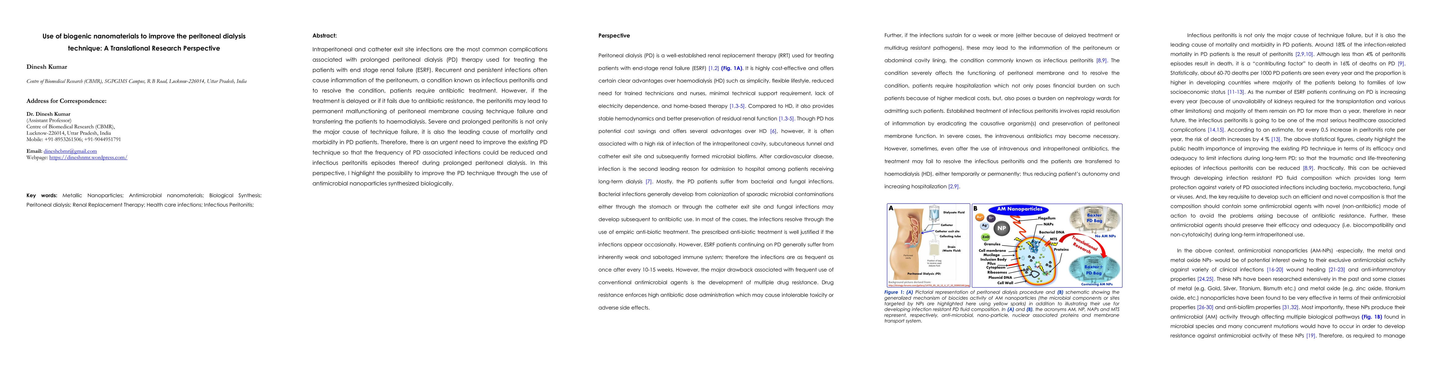 Intraperitoneal and catheter exit site infections are the most common complications associated with prolonged peritoneal dialysis (PD) therapy used for treating the patients with end stage renal failure (ESRF). Recurrent and persistent infections often cause inflammation of the peritoneum, a condition known as infectious peritonitis and to resolve the condition, patients require antibiotic treatment. However, if the treatment is delayed or if it fails due to antibiotic resistance, the peritonitis may lead to permanent malfunctioning of peritoneal membrane causing technique failure and transferring the patients to haemodialysis. Severe and prolonged peritonitis is not only the major cause of technique failure, it is also the leading cause of mortality and morbidity in PD patients. Therefore, there is an urgent need to improve the existing PD technique so that the frequency of PD associated infections could be reduced and infectious peritonitis episodes thereof during prolonged peritoneal dialysis. In this perspective, I highlight the possibility to improve the PD technique through the use of antimicrobial nanoparticles synthesized biologically.