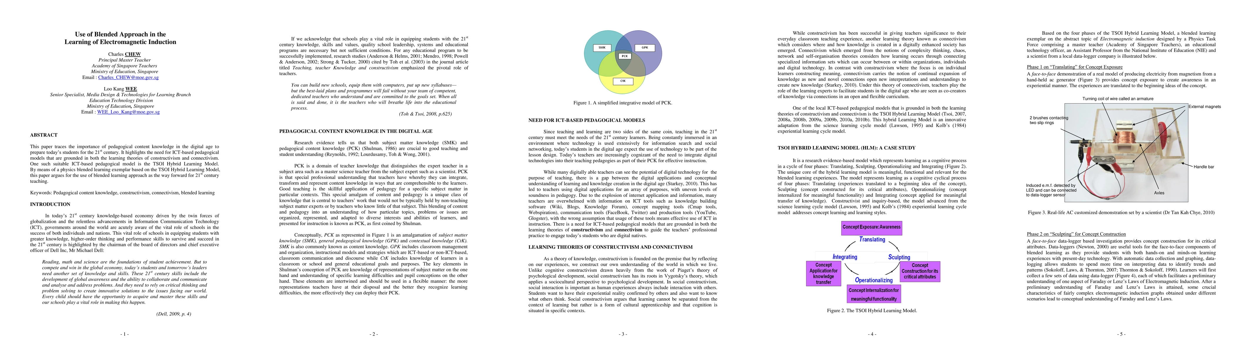 This paper advocates for a blended learning approach in teaching electromagnetic induction using the TSOI Hybrid Learning Model, highlighting its suitability for 21st-century teaching. It argues that this approach prepares students for the digital age by incorporating both constructivism and connectivism into ICT-based pedagogical models.
