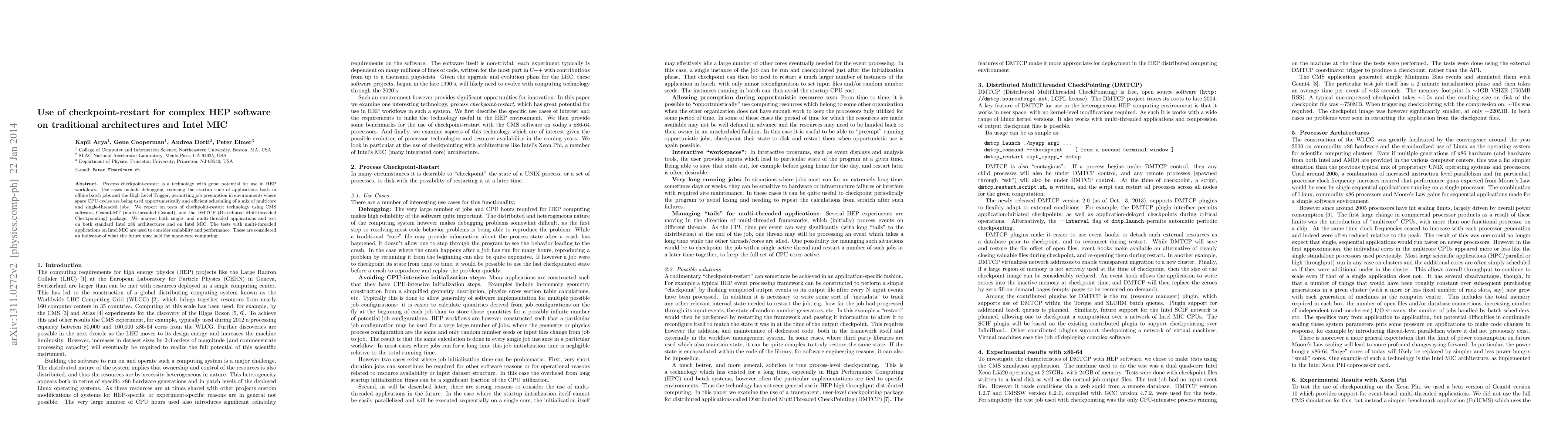 Researchers tested checkpoint-restart technology on CMS software and Geant4-MT for debugging, startup time reduction, and efficient scheduling on Intel x86 architectures and Intel MIC, finding it scalable and performant for multi-threaded applications.