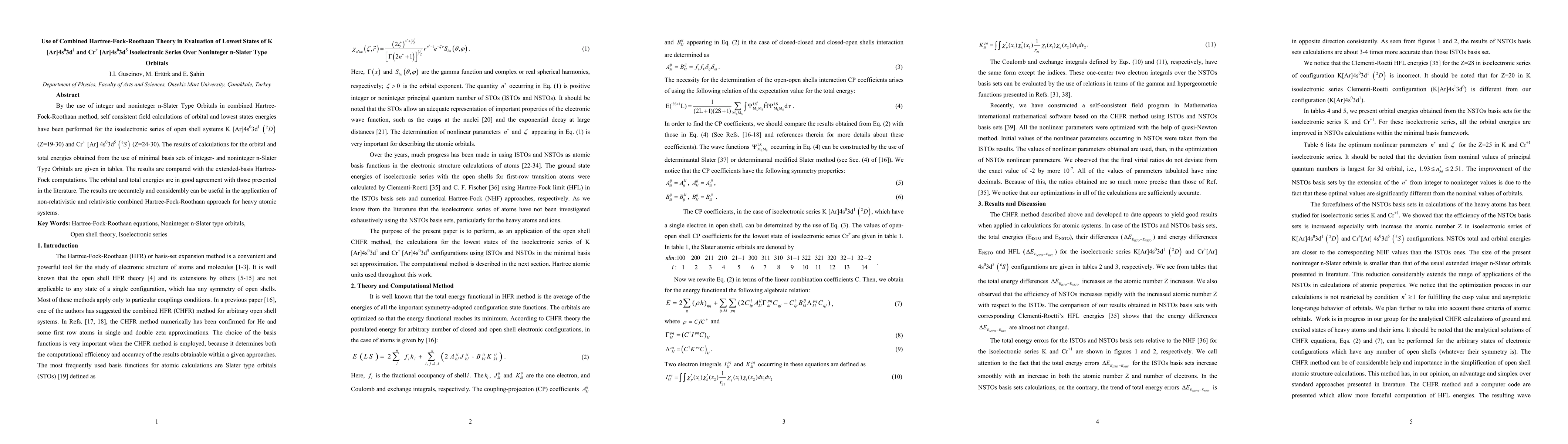 By the use of integer and noninteger n-Slater Type Orbitals in combined Hartree-Fock-Roothaan method, self consistent field calculations of orbital and lowest states energies have been performed for the isoelectronic series of open shell systems K [Ar]4s^0 3d^1 2(D) (Z=19-30) and Cr+ [Ar] 4s^0 3d^5 6(S) (Z=24-30). The results of calculations for the orbital and total energies obtained from the use of minimal basis sets of integer- and noninteger n-Slater Type Orbitals are given in tables. The results are compared with the extended-basis Hartree-Fock computations. The orbital and total energies are in good agreement with those presented in the literature. The results are accurately and considerably can be useful in the application of non-relativistic and relativistic combined Hartree-Fock-Roothaan approach for heavy atomic systems.