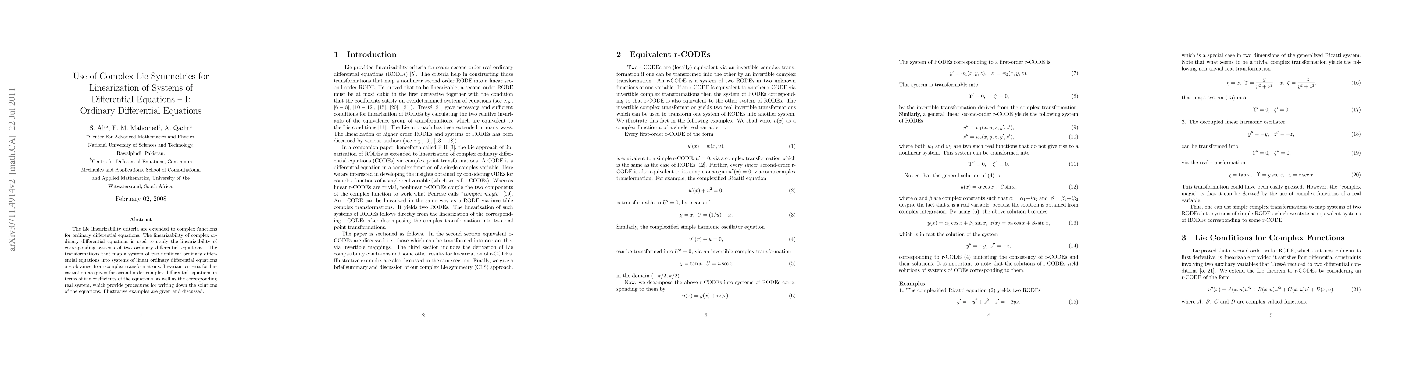 A novel approach to linearization of differential equations using complex Lie symmetries was employed.