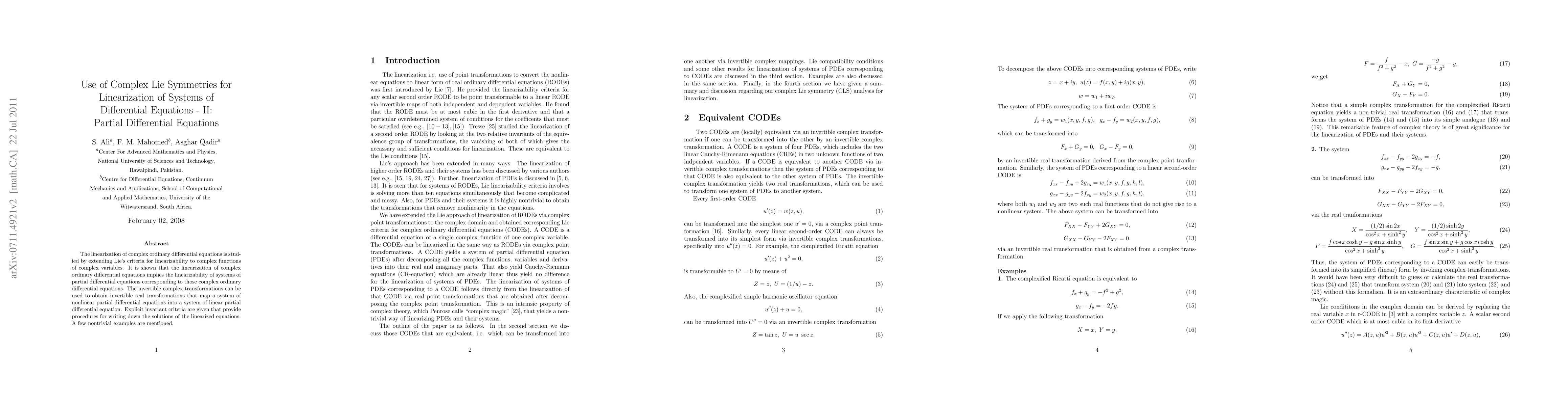 This paper extends Lie's linearizability criteria to complex functions and demonstrates that linearizing complex ordinary differential equations also linearizes corresponding systems of partial differential equations. It introduces invertible transformations to convert nonlinear partial differential equations into linear ones, providing explicit invariant criteria for solution derivation.