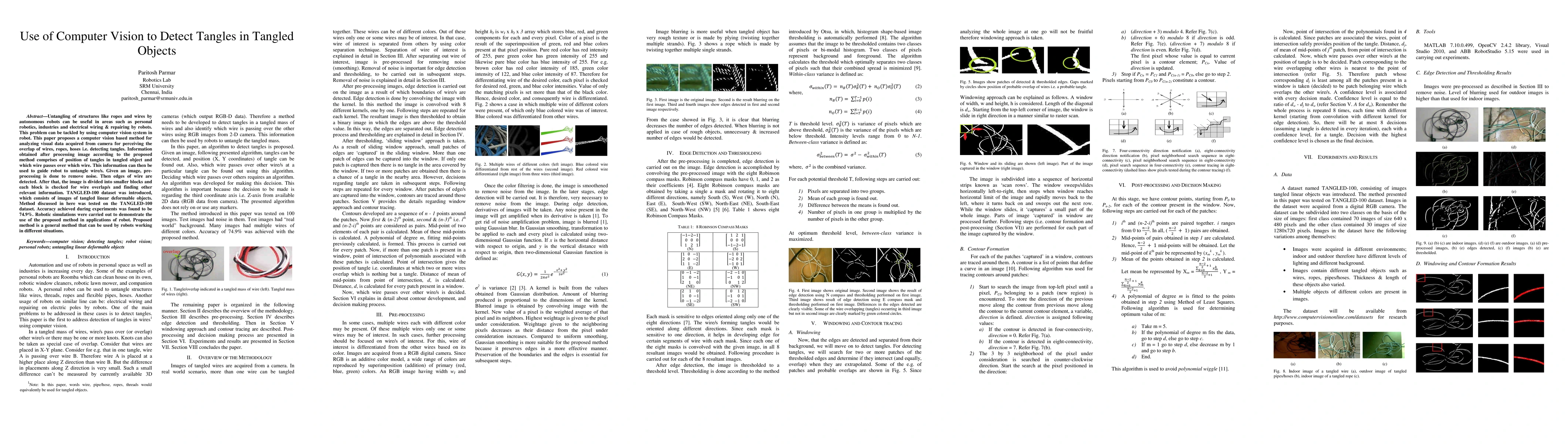 Untangling of structures like ropes and wires by autonomous robots can be useful in areas such as personal robotics, industries and electrical wiring & repairing by robots. This problem can be tackled by using computer vision system in robot. This paper proposes a computer vision based method for analyzing visual data acquired from camera for perceiving the overlap of wires, ropes, hoses i.e. detecting tangles. Information obtained after processing image according to the proposed method comprises of position of tangles in tangled object and which wire passes over which wire. This information can then be used to guide robot to untangle wire/s. Given an image, preprocessing is done to remove noise. Then edges of wire are detected. After that, the image is divided into smaller blocks and each block is checked for wire overlap/s and finding other relevant information. TANGLED-100 dataset was introduced, which consists of images of tangled linear deformable objects. Method discussed in here was tested on the TANGLED-100 dataset. Accuracy achieved during experiments was found to be 74.9%. Robotic simulations were carried out to demonstrate the use of the proposed method in applications of robot. Proposed method is a general method that can be used by robots working in different situations.