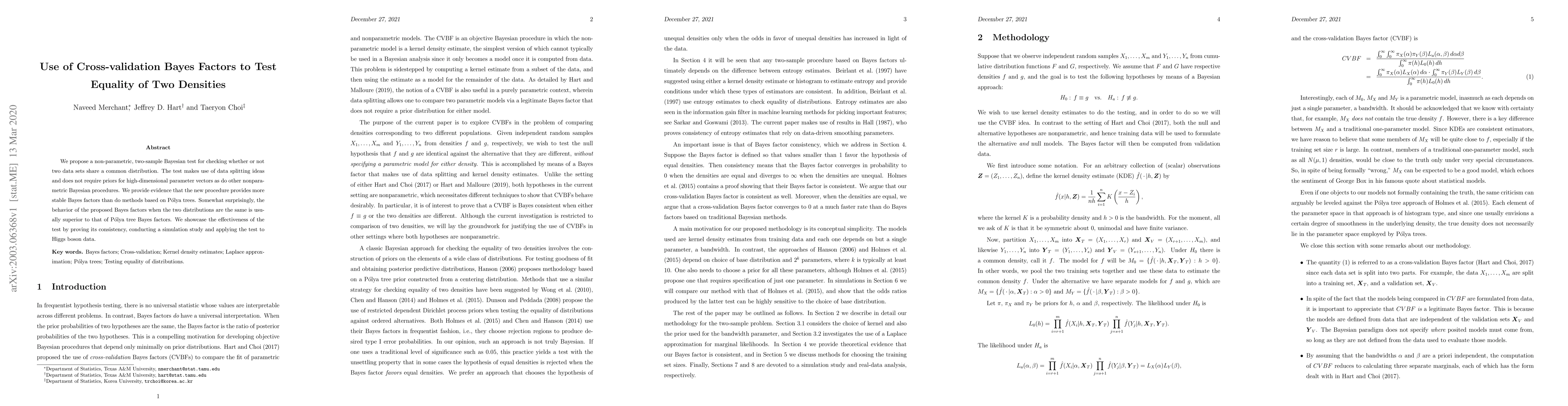 A new non-parametric Bayesian test uses cross-validation Bayes factors to determine if two distributions share a common distribution, providing more stable results than traditional methods in some cases.