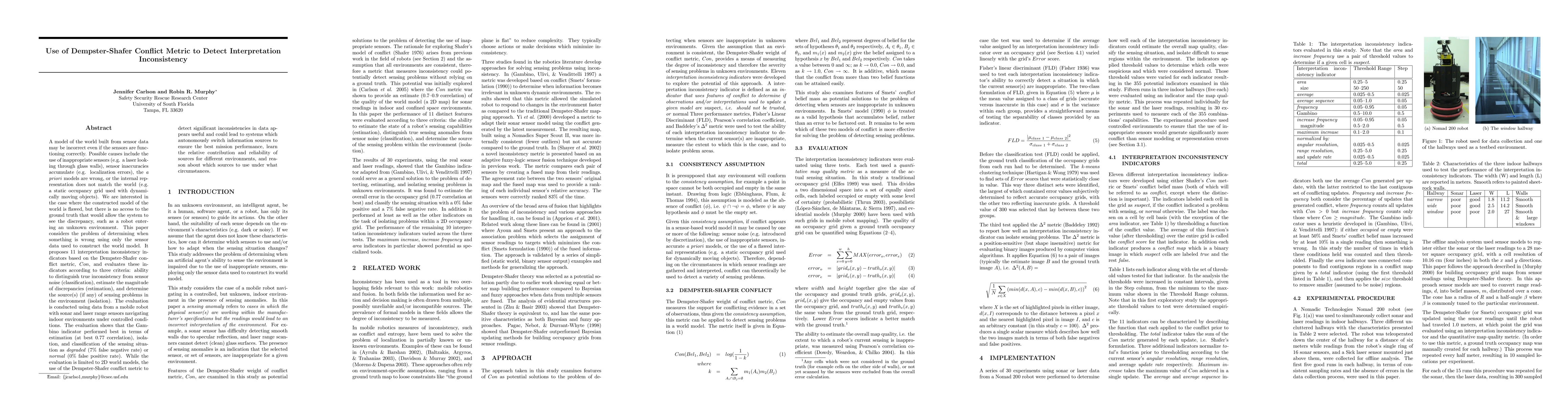 A model of the world built from sensor data may be incorrect even if the sensors are functioning correctly. Possible causes include the use of inappropriate sensors (e.g. a laser looking through glass walls), sensor inaccuracies accumulate (e.g. localization errors), the a priori models are wrong, or the internal representation does not match the world (e.g. a static occupancy grid used with dynamically moving objects). We are interested in the case where the constructed model of the world is flawed, but there is no access to the ground truth that would allow the system to see the discrepancy, such as a robot entering an unknown environment. This paper considers the problem of determining when something is wrong using only the sensor data used to construct the world model. It proposes 11 interpretation inconsistency indicators based on the Dempster-Shafer conflict metric, Con, and evaluates these indicators according to three criteria: ability to distinguish true inconsistency from sensor noise (classification), estimate the magnitude of discrepancies (estimation), and determine the source(s) (if any) of sensing problems in the environment (isolation). The evaluation is conducted using data from a mobile robot with sonar and laser range sensors navigating indoor environments under controlled conditions. The evaluation shows that the Gambino indicator performed best in terms of estimation (at best 0.77 correlation), isolation, and classification of the sensing situation as degraded (7% false negative rate) or normal (0% false positive rate).