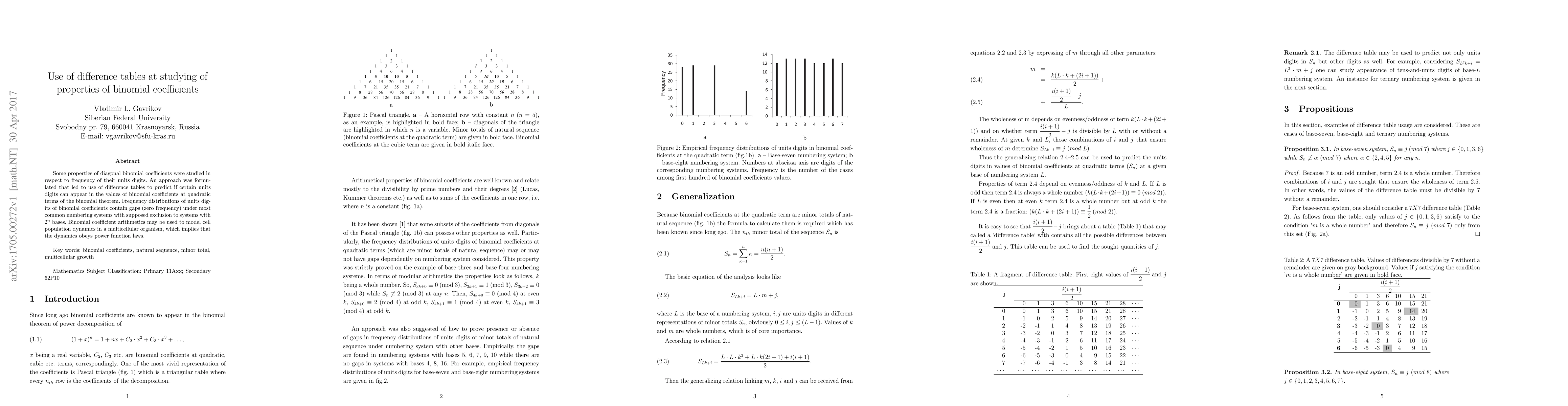 This research explores properties of binomial coefficients' units digits using difference tables. It finds that frequency distributions of these digits exhibit gaps, except in base systems with 2^n, and suggests binomial coefficient arithmetic can model cell population dynamics following power function laws.