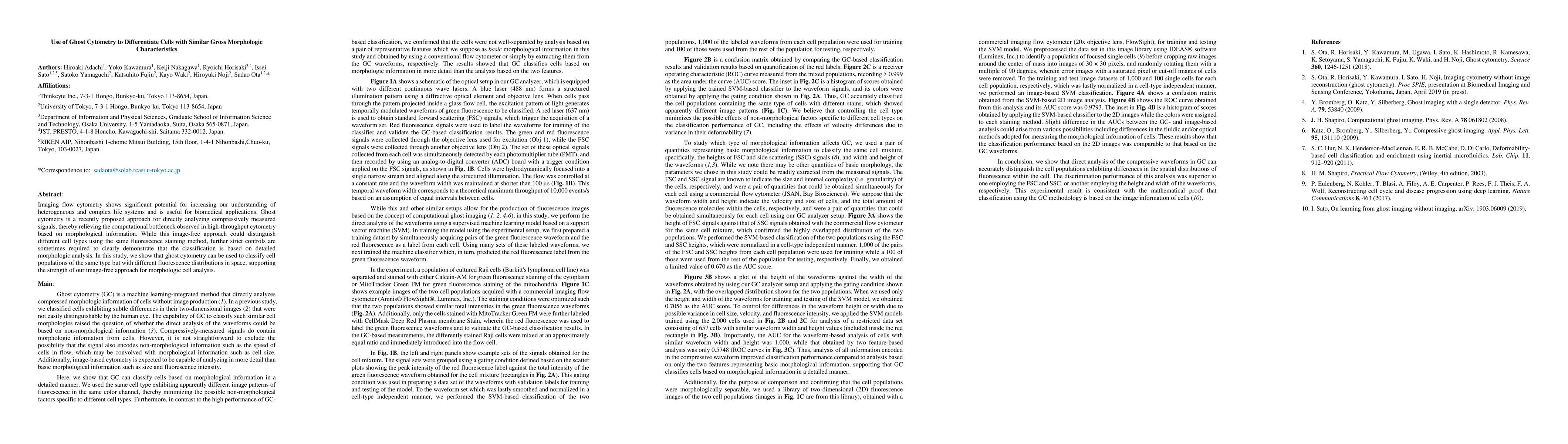 This paper demonstrates that ghost cytometry can effectively differentiate cells with similar gross morphology by analyzing compressively measured signals, offering a computationally efficient alternative to traditional high-throughput cytometry. The study supports the method's potential for classifying cell populations with varying fluorescence distributions without relying on imaging.